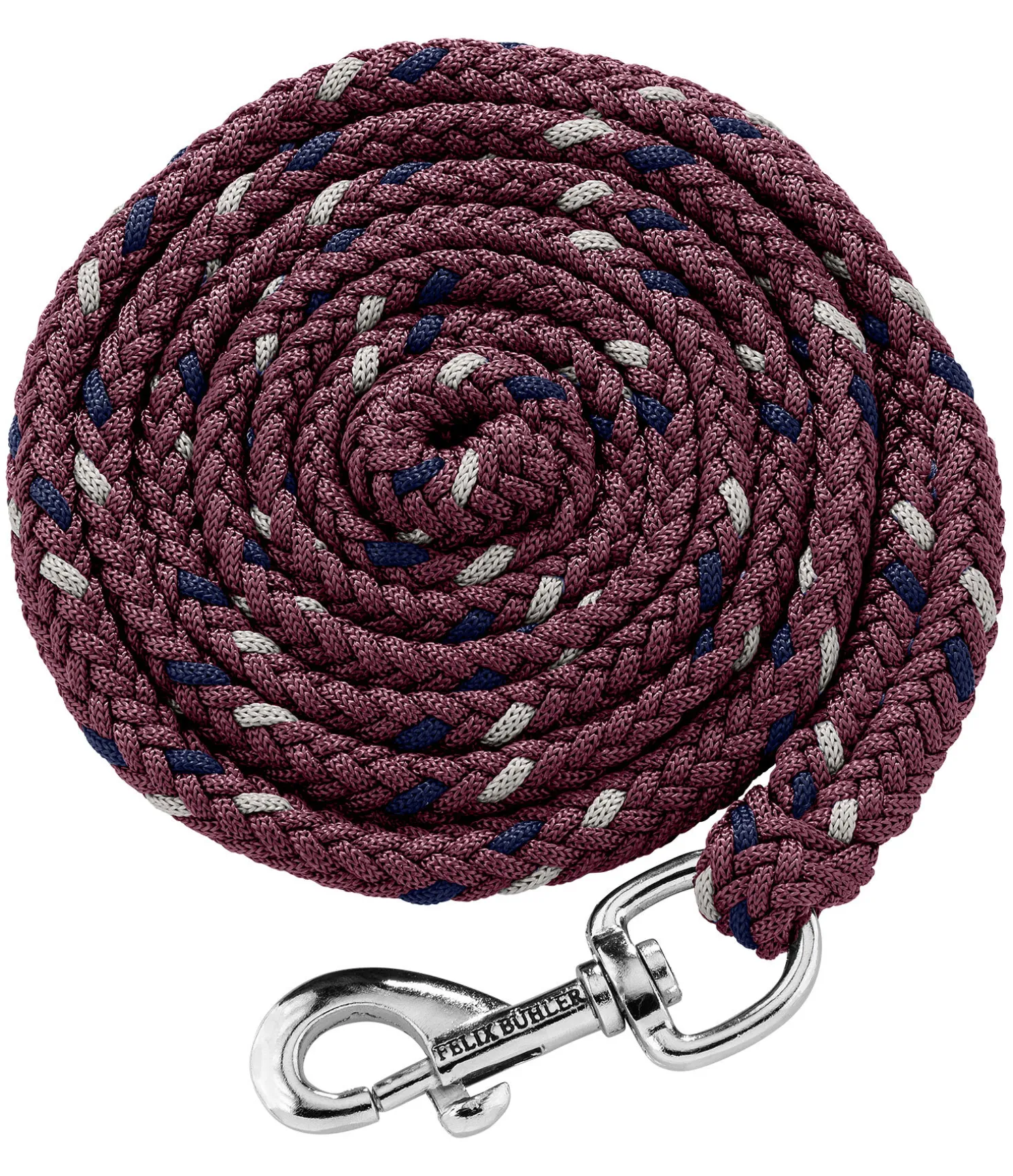 Longe tressée tricolore solide avec mousqueton. 2 m. 100 % polyester. Assortie au licol 310057.
