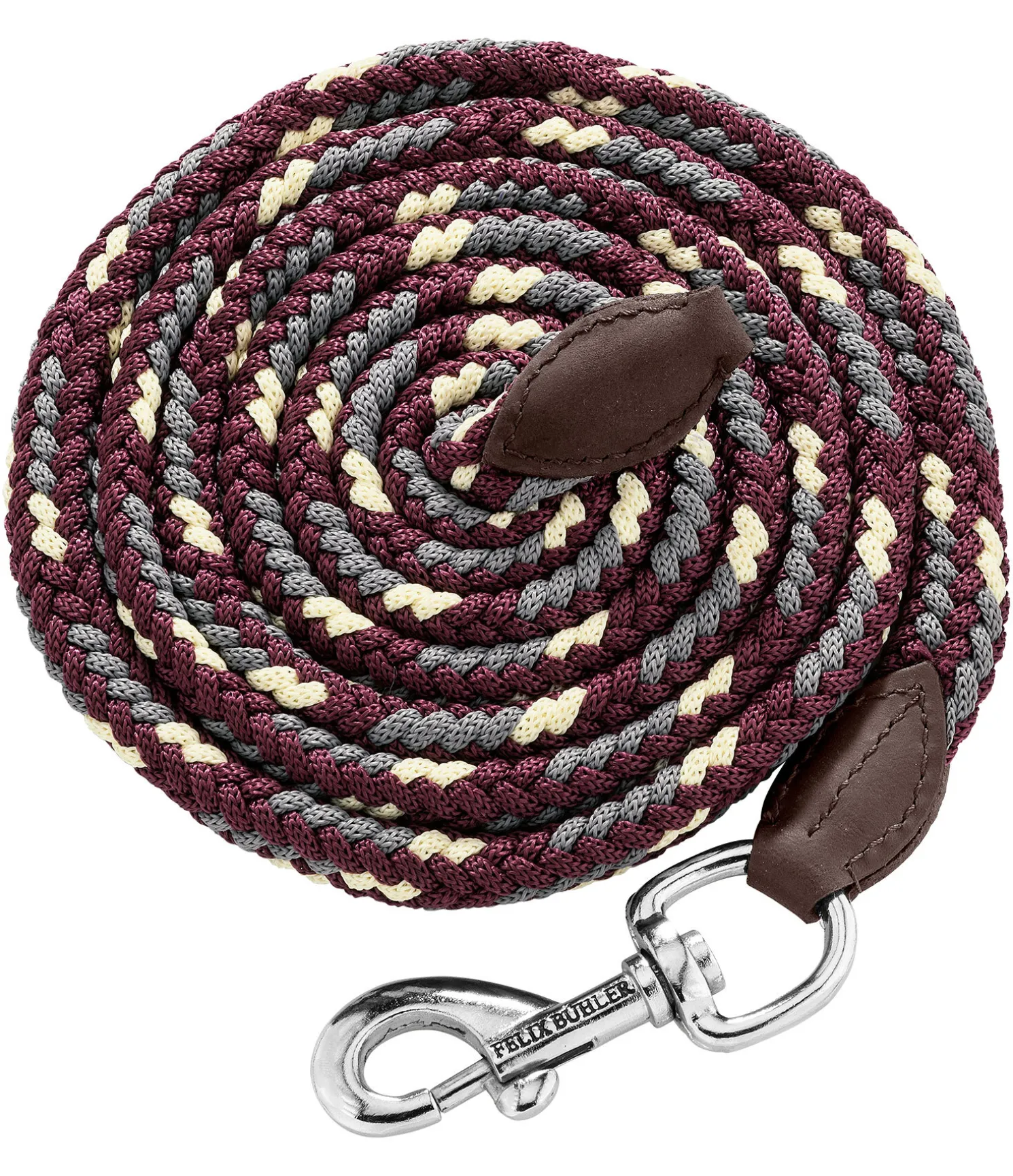 Longe tressée ronde très résistante avec élégants embouts en cuir et mousqueton. Assortie au licol 310040. Bouclerie argentée. 2 m. 100 % polypropylène.
