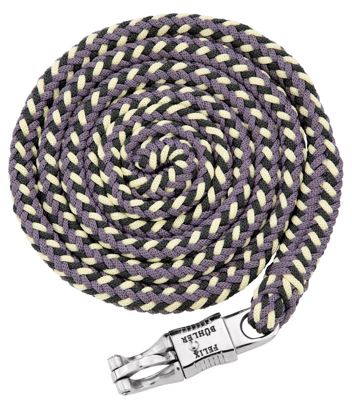 Longe tressée tricolore solide avec mousqueton anti-panique. 2 m. 100 % polyester. Assortie au licol 310056.