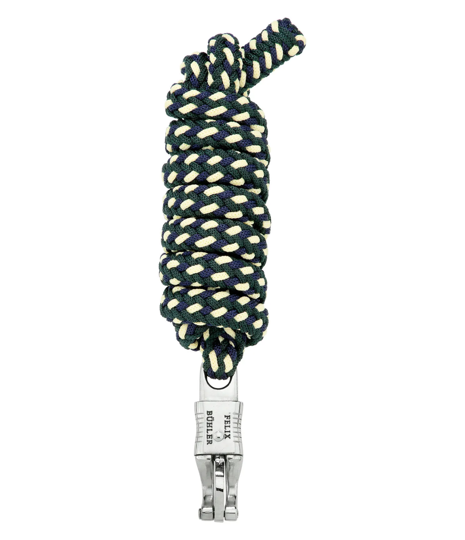 Longe tressée tricolore solide avec mousqueton anti-panique. 2 m. 100 % polyester. Assortie au licol 310056.