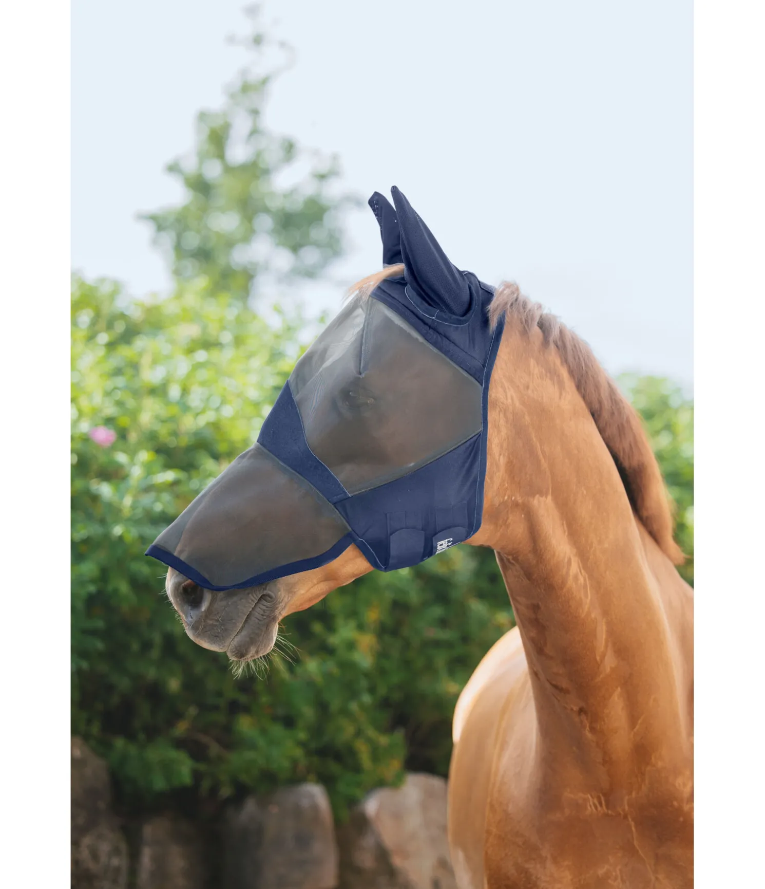 Masque anti-mouches avec protège-naseaux extra-long, pour les chevaux sensibles et / ou ayant tendance à secouer la tête. Mailles serrées et coutures permettant de maintenir le filet à distance des yeux. Matière à mailles respirantes aux oreilles. Protège parfaitement les oreilles et les yeux contre les moustiques et autres insectes. Doublure en polaire Teddy douillette au niveau du front pour éviter les irritations dues aux frottements. Avec passage de toupet et double patte auto-agrippante pour un maintien sûr. 100 % polyester.