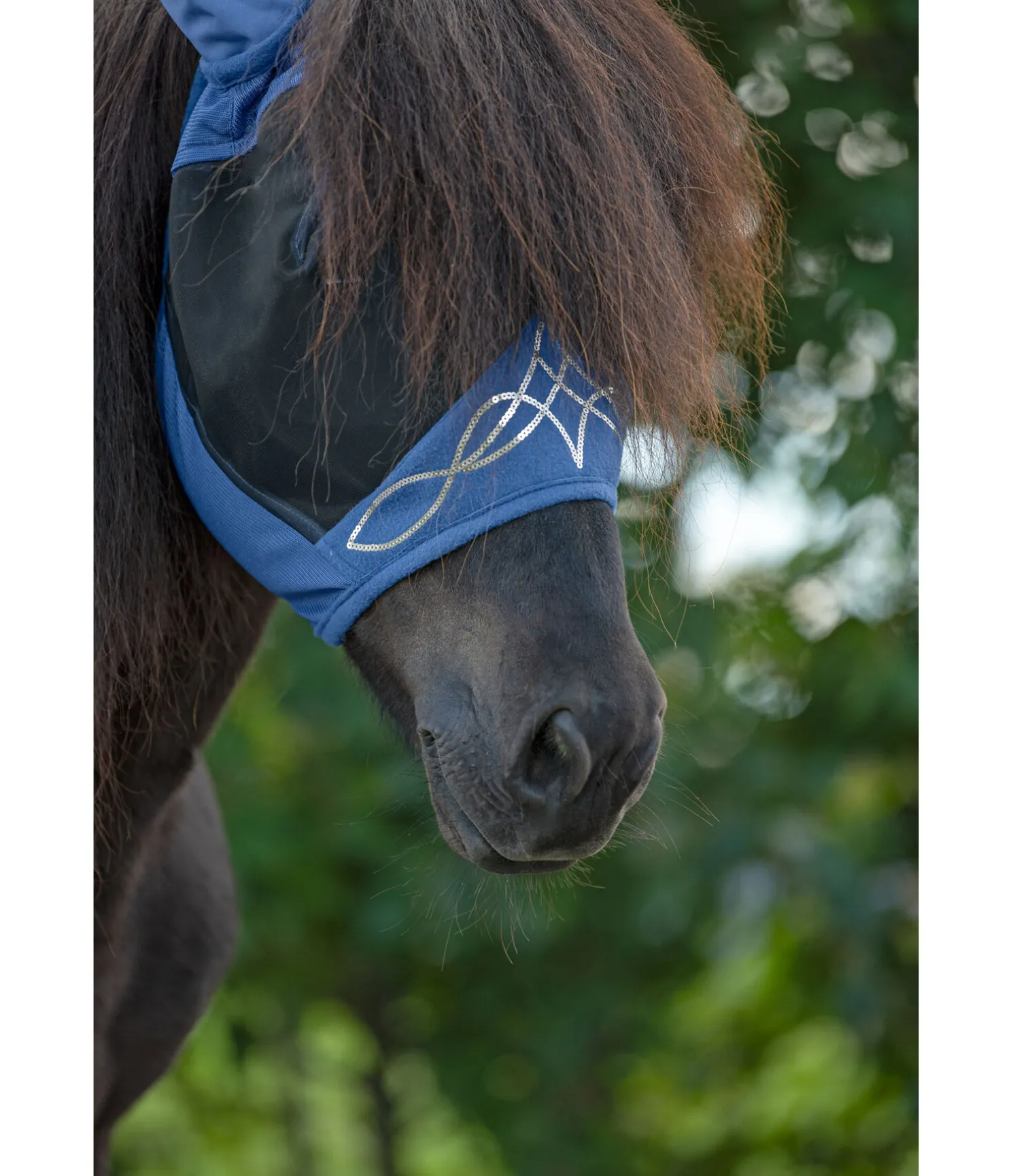 Masque anti-mouches chic et fonctionnel orné d’une broderie à sequins. Éloigne les mouches des yeux du cheval en ajoutant une touche glamour.
