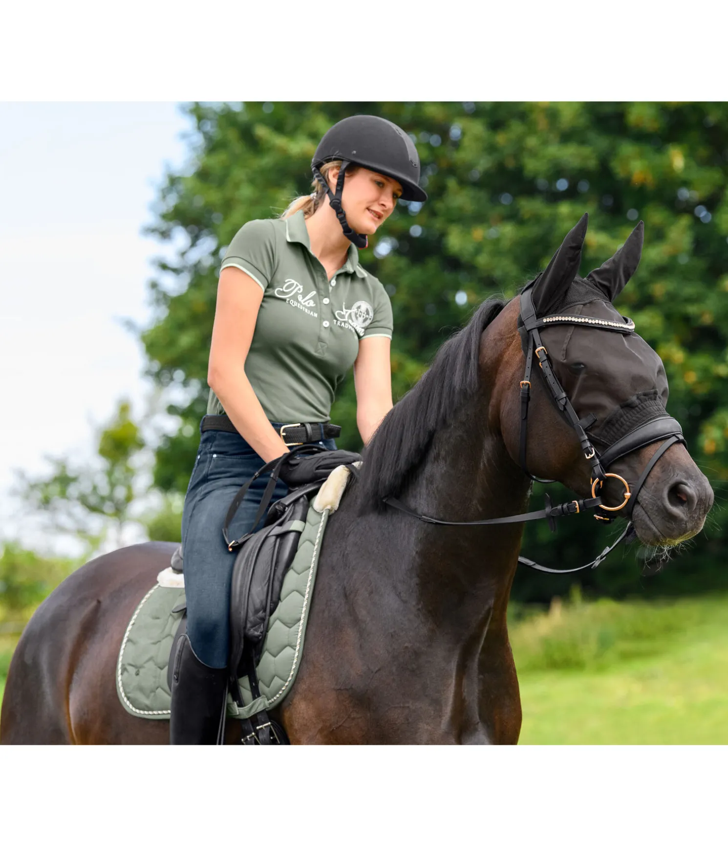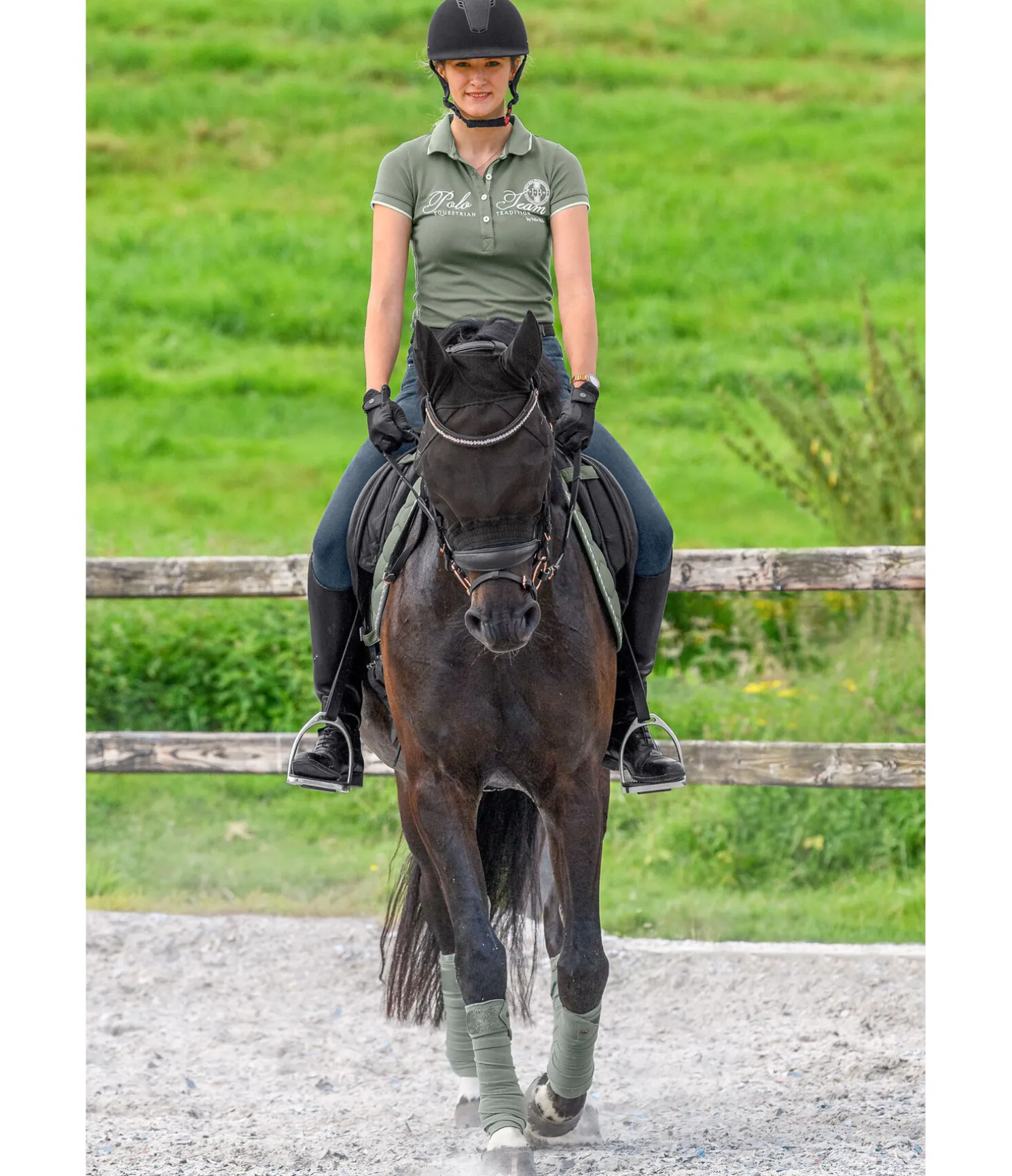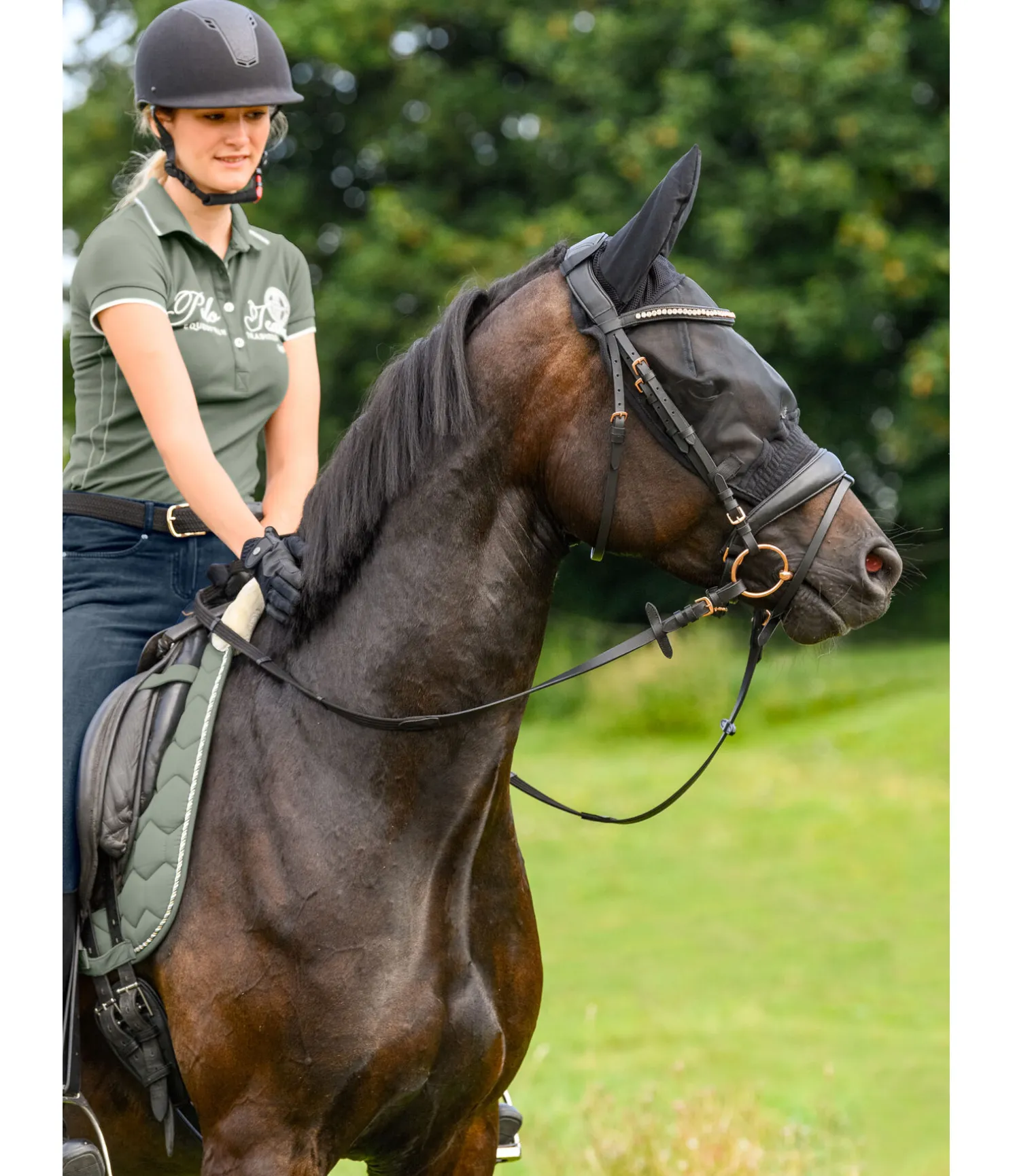 Combinaison innovante d’un bonnet anti-mouches et d’un masque anti-mouches. Partie des oreilles en matière filet élastique particulièrement légère et respirante. Partie au niveau des yeux en filet noir à mailles serrées protégeant efficacement contre les insectes. Fixation par patte auto-agrippante élastique au niveau de la têtière et des deux côtés du bridon. Bordure confortable et élastique au niveau de la muserolle. 100 % polyester.