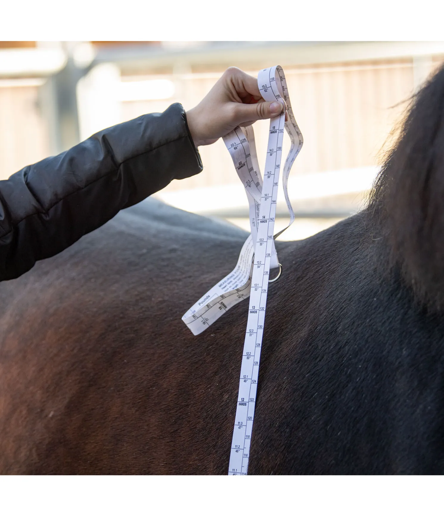 Pour déterminer le poids approximatif de ton cheval, positionne le mètre au niveau du passage de sangle, juste derrière les antérieurs et le garrot. Fais le tour du ventre de ton cheval avec le mètre. Tu peux lire les mesures suivantes :