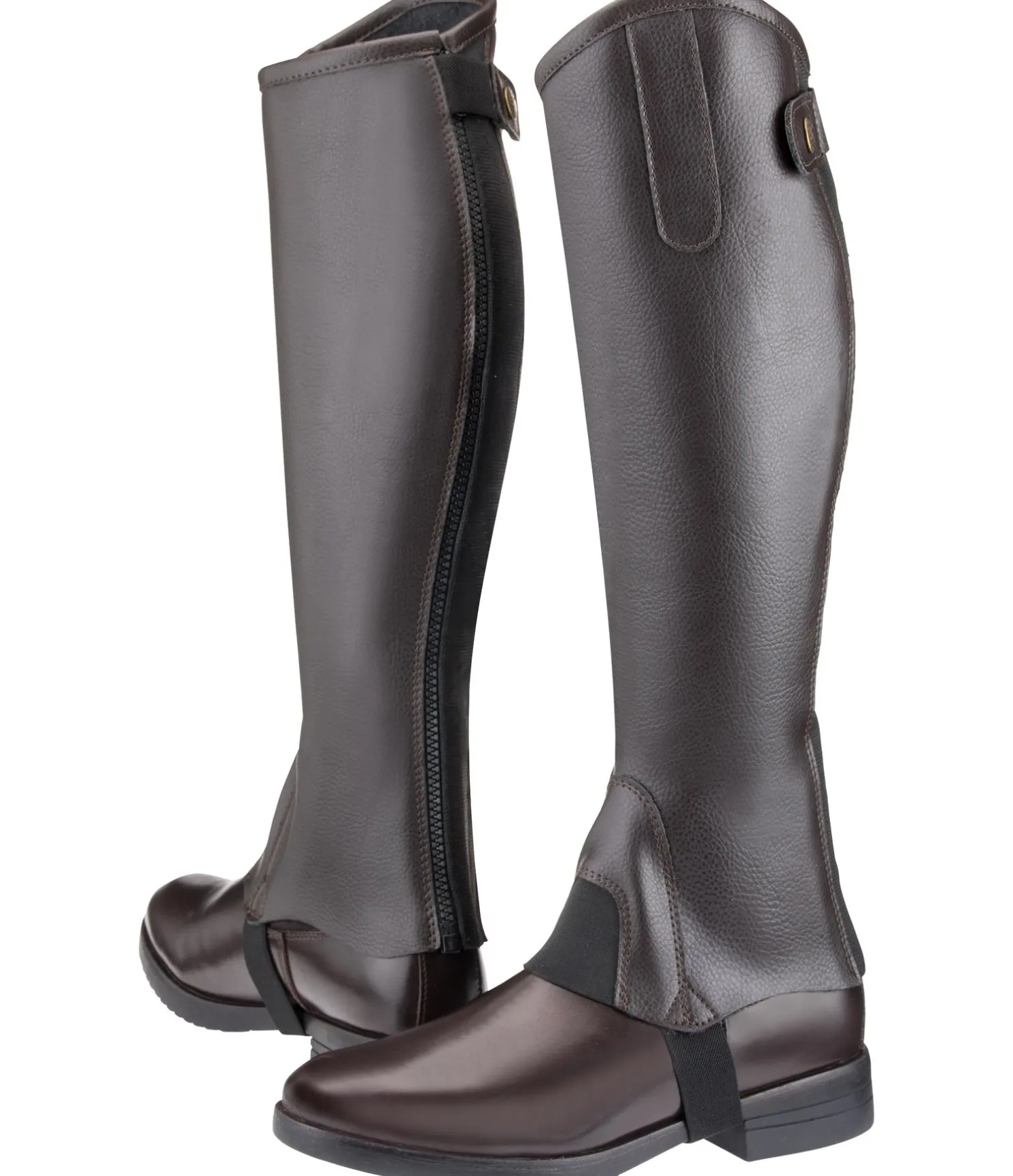 Mini-chaps élégantes dans un design évoquant des bottes cavalières. Matière synthétique à l’aspect grainé. Empiècement extensible à l’arrière le long de la solide fermeture à glissière YKK pour un ajustement parfait au mollet. Fermeture par bouton-pression et sous-pieds solides.