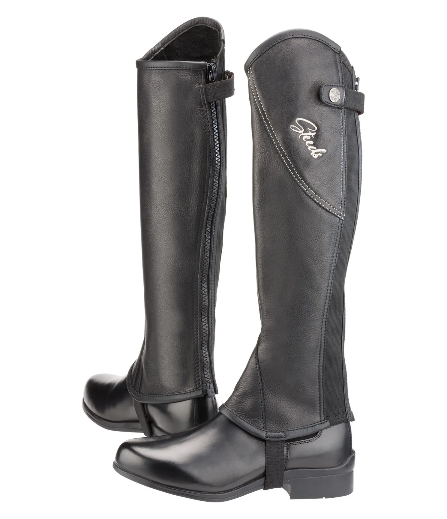 Mini-chaps au look exceptionnel. Insert en cuir avec coutures et logo de couleur contrastante sur le haut de la tige. Souples et élegantes. Fermeture à glissière à l’arrière avec inserts élastiqués de chaque côté pour un ajustement optimal. Dessus en cuir de vachette naturellement grainé, à la fois souple et résistant.