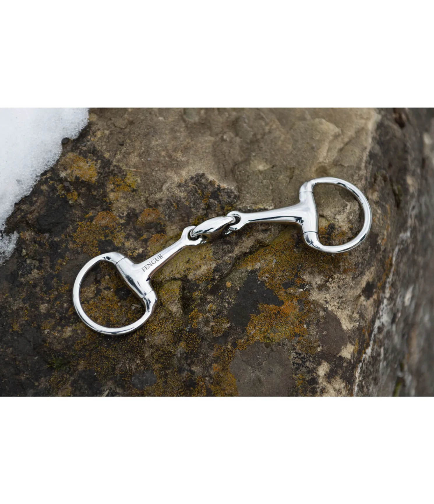 Mors à olives double brisure en acier inoxydable, bloqué par angle de brisure maximal : lorsque les rênes agissent sur les anneaux du mors, le mors devient droit. Particulièrement adapté aux chevaux qui ont tendance à se bloquer contre la main du cavalier. Épaisseur 14 mm.