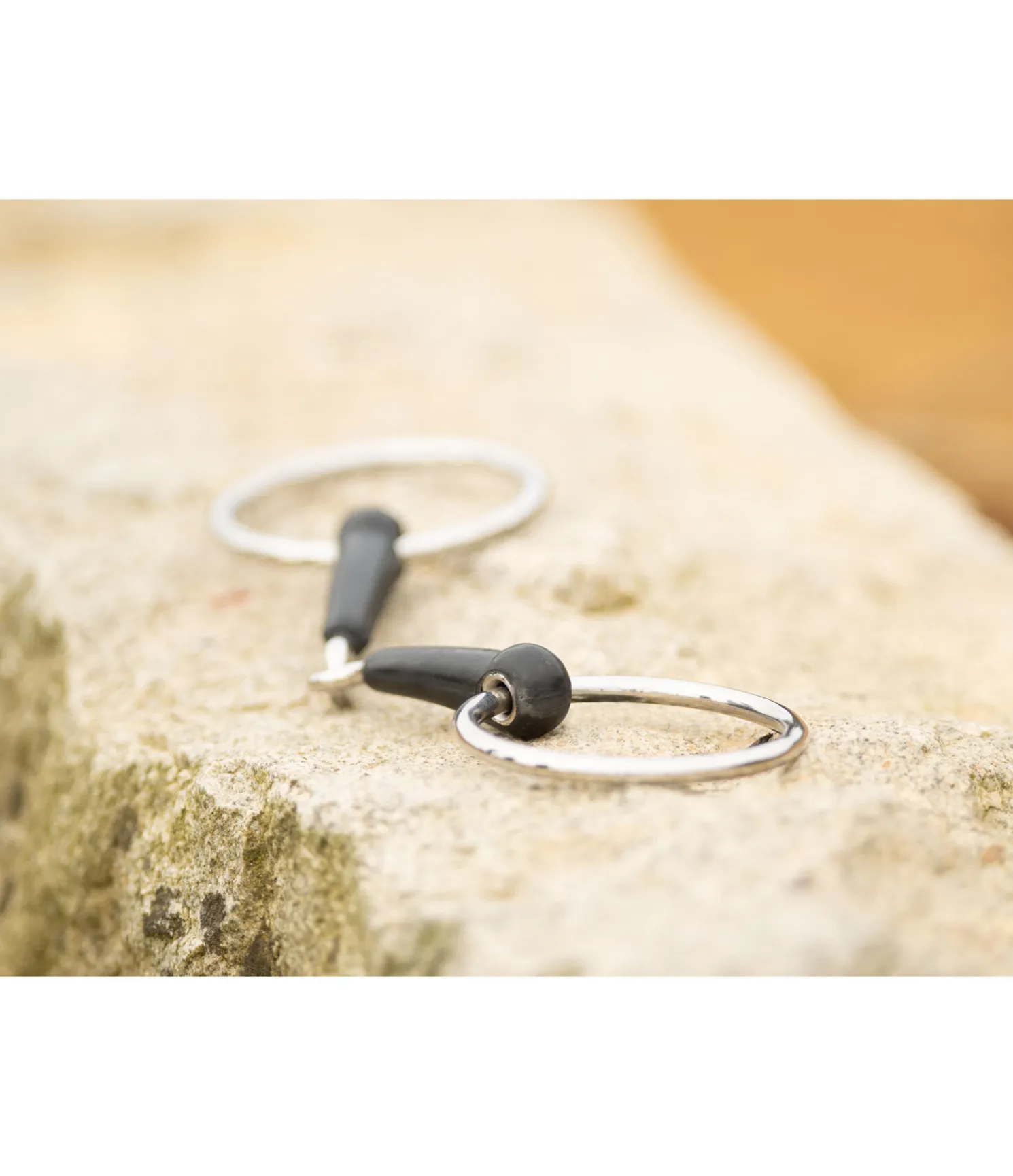 Mors simple brisure en caoutchouc moelleux et résistant avec âme en acier. Épaisseur des canons : 14 mm. Diamètre des anneaux : 70 mm. Durée de vie : les mors en résine ou en caoutchouc ont une durée de vie très variable, qui dépend principalement de l’état de la dentition du cheval (crochets, etc.) et de l’ajustement du mors.