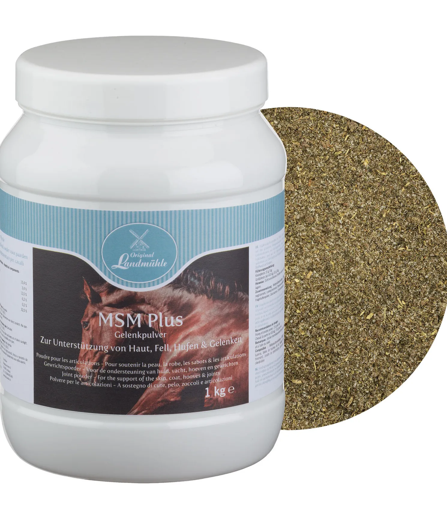 Composition : méthyl-sulfonyl-méthane (MSM) 35 %, farine de luzerne 26 %, farine de tourteau de lin 20 %, feuilles d’ortie (hachées finement) 8 %, poudre de cynorrhodons 8 %, glucosamine 2%, sulfate de chondroïtine 1%.
