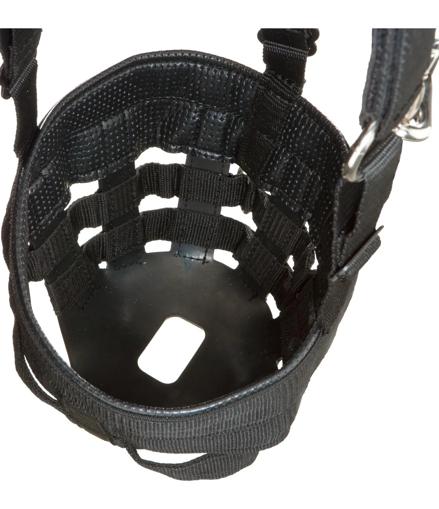 Empêche le cheval de manger trop ou trop vite au pré. Conception confortable avec un rembourrage doux à la têtière ainsi qu’à l’intérieur de la muselière. Avec découpe au niveau des naseaux. Fond du panier en caoutchouc robuste et souple. Par mesure de sécurité, la lanière passant par la nuque se ferme par une double patte auto-agrippante qui assure un bon maintien mais s’ouvre rapidement si le cheval s’accroche quelque part. L’anneau au bas du panier est à utiliser seulement pour effectuer de courtes distances et ne doit pas être utilisé pour l’attache. Nombreux réglages pour un ajustement parfait.