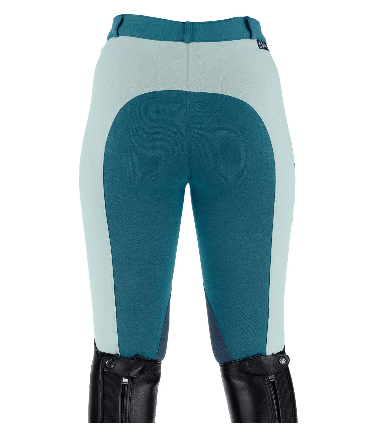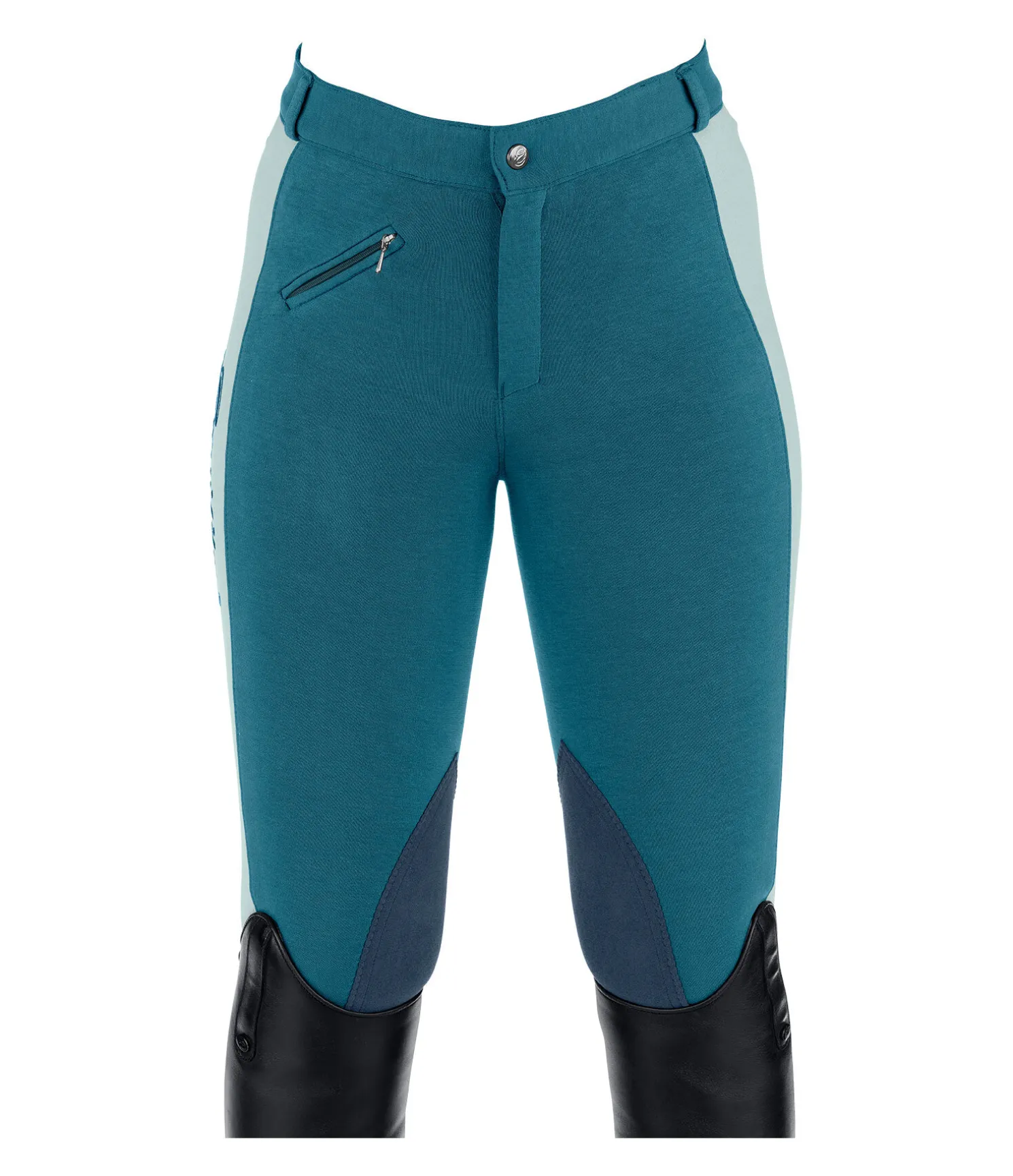 Pantalon d’équitation bicolore à basanes. Broderie de couleur contrastante sur la cuisse. 92 % coton, 8 % élasthanne.