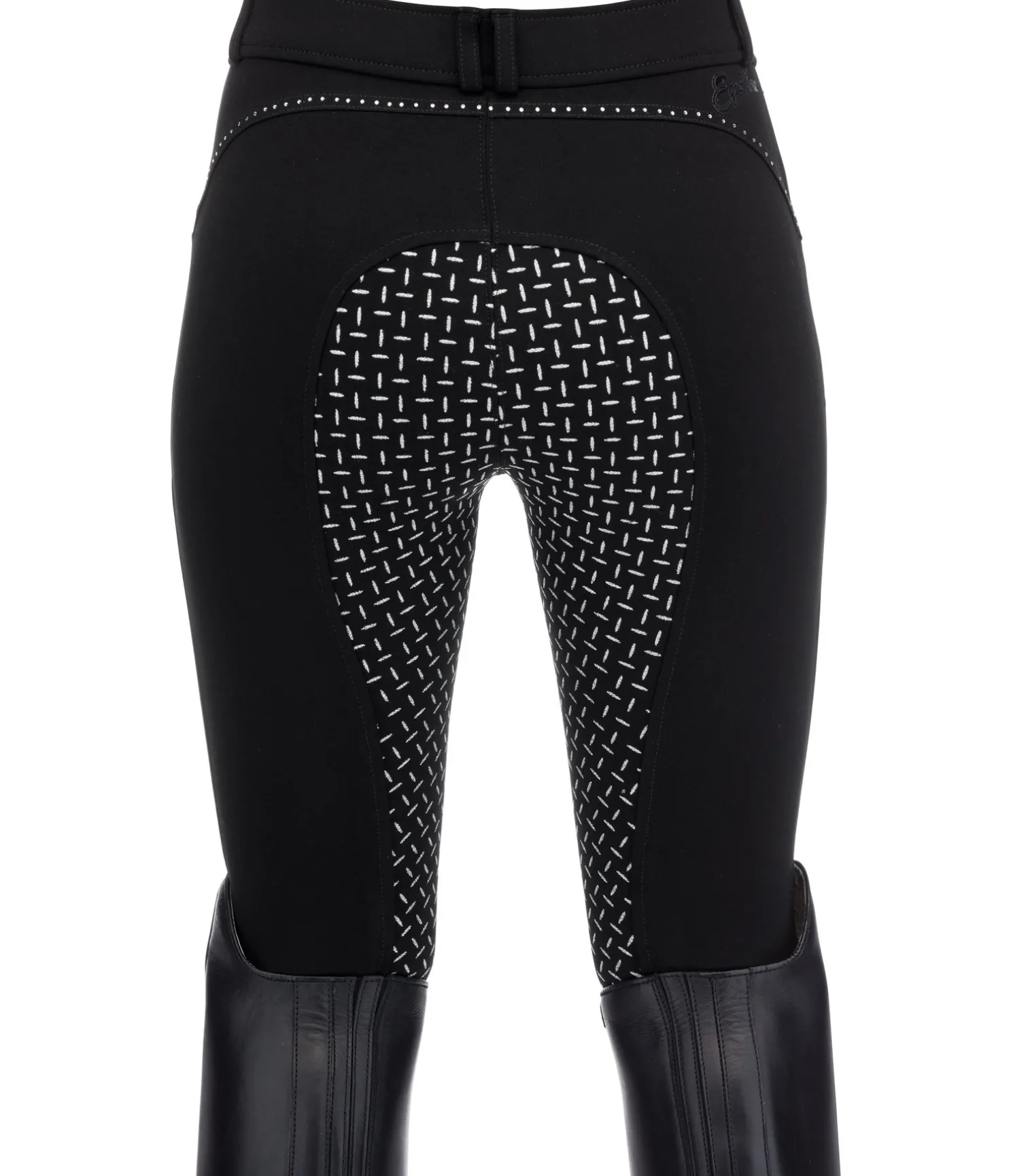 Pantalon d’équitation. Fond intégral grip en silicone scintillant. Matière stretch respirante, extensible dans 4 directions et ultra confortable. Strass sur les poches avant. Bas de jambe extensible sans patte auto-agrippante. 68 % viscose, 27 % polyamide, 5 % élasthanne.