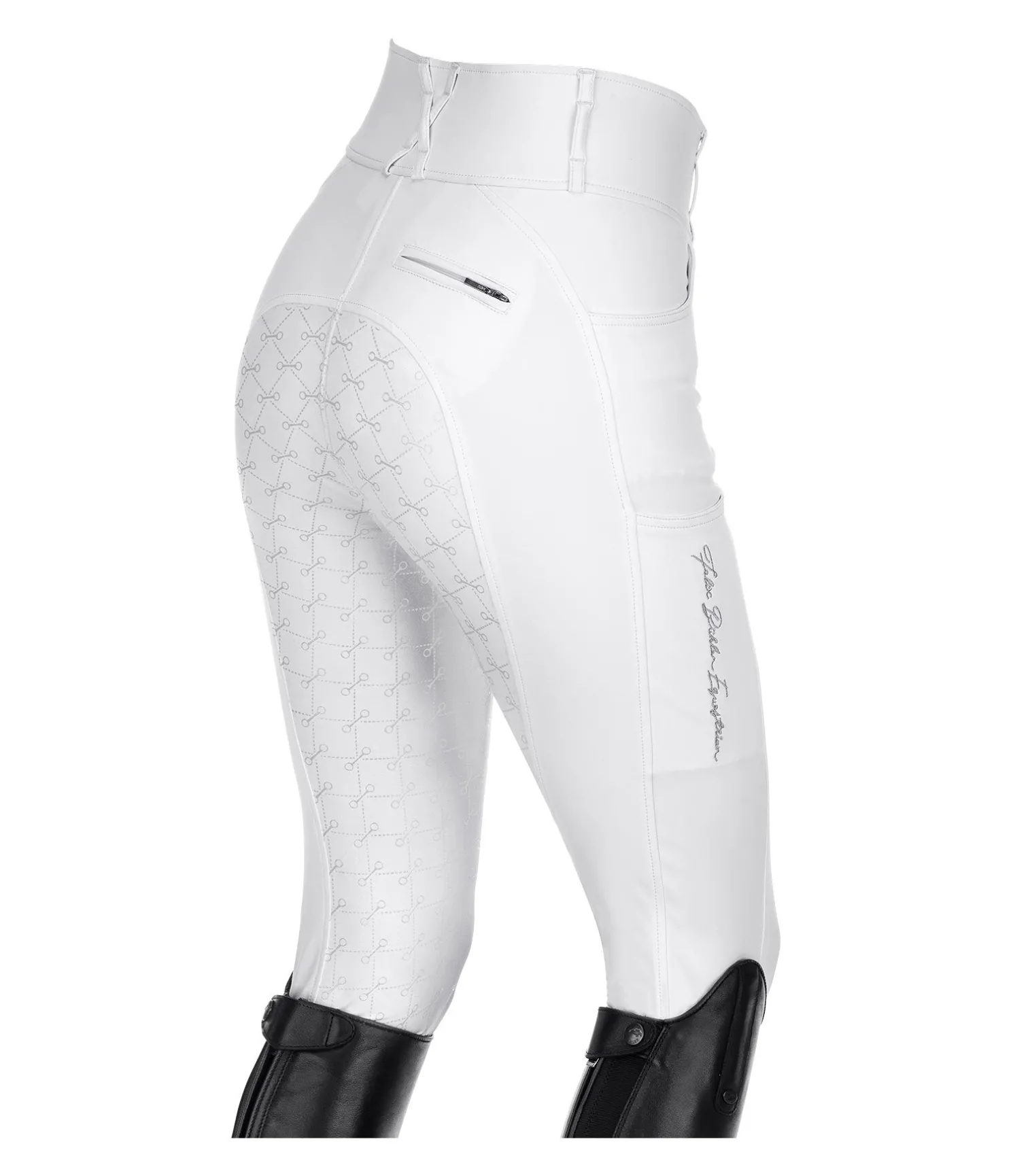 Pantalon d’équitation sportswear et extensible, à fond intégral grip en silicone avec motifs de mors. Matière déperlante, respirante et à séchage rapide. Broderie Felix Bühler sur la jambe. Poche arrière zippée et poche pour téléphone portable sur la cuisse. Deux poches avant. Ceinture à passants extra large élastiquée avec 2 boutons. Aucune couture aux genoux. Bas de jambe extensible en stretch. 89 % nylon, 11 % élasthanne.