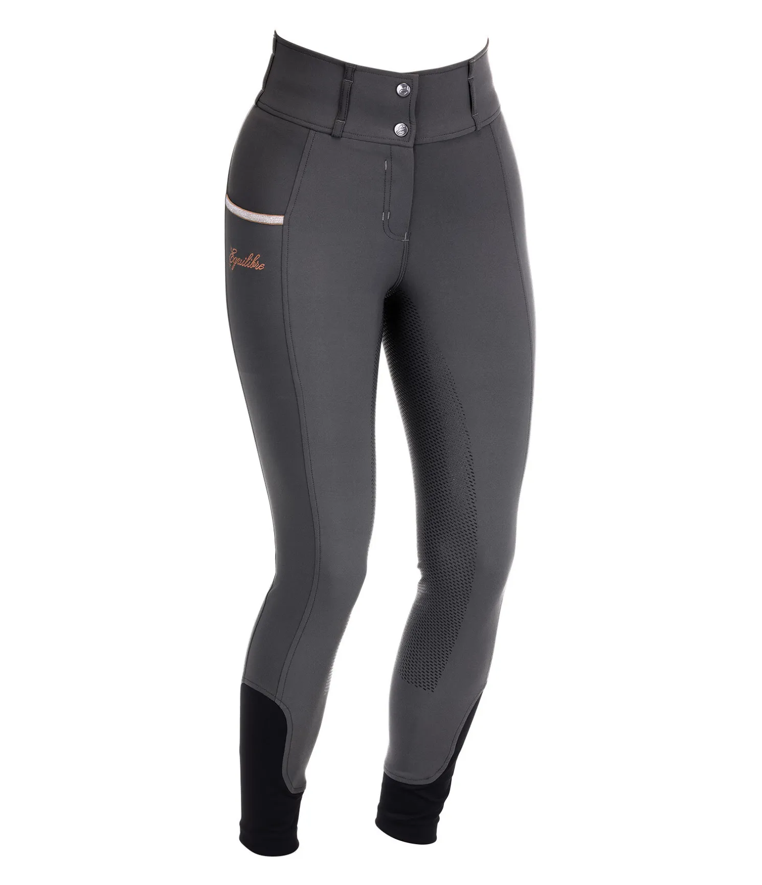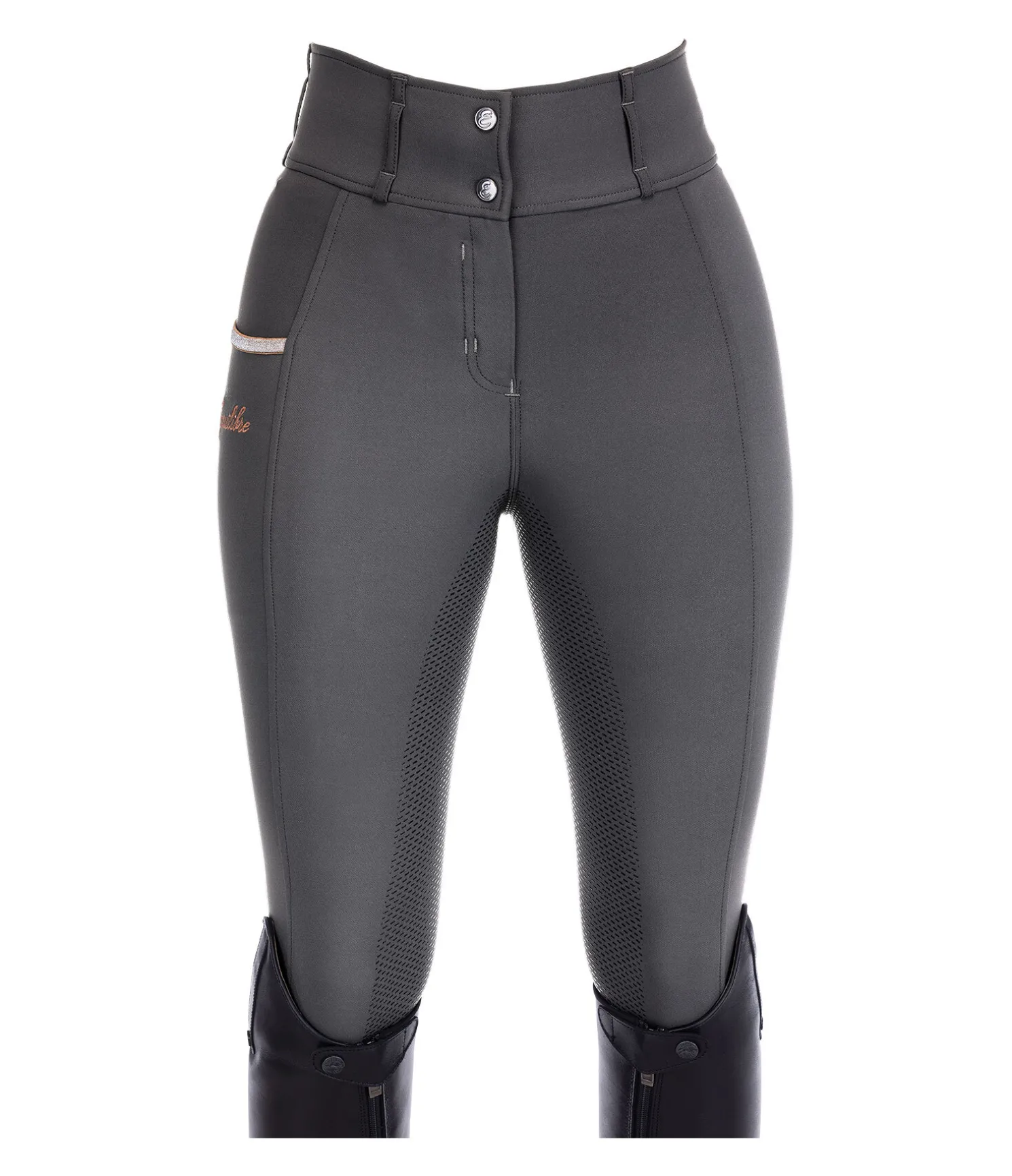 Super rapport qualité-prix ! Pantalon d’équitation technique avec fond intégral grip en silicone. Matière stretch respirante. Séchage rapide. 1 poche arrière zippée.1 poche latérale pour téléphone portable ornée d’une bande scintillante. Ceinture élastiquée extra large avec 2 boutons. Aucune couture aux genoux. Bas de jambe extensible. 88 % nylon, 12 % élasthanne.