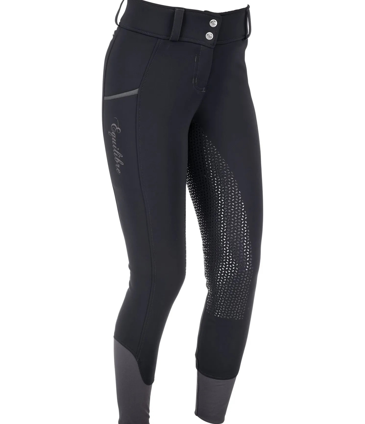Legging d’équitation confortable avec fond intégral grip en silicone. Matière extensible lisse à l’extérieur et confortable à l’intérieur. Ceinture extra large élastiquée. Une poche zippée pour téléphone portable sur la cuisse. Bas de jambe extensible sans patte auto-agrippante. 86 % polyester, 14 % élasthanne.