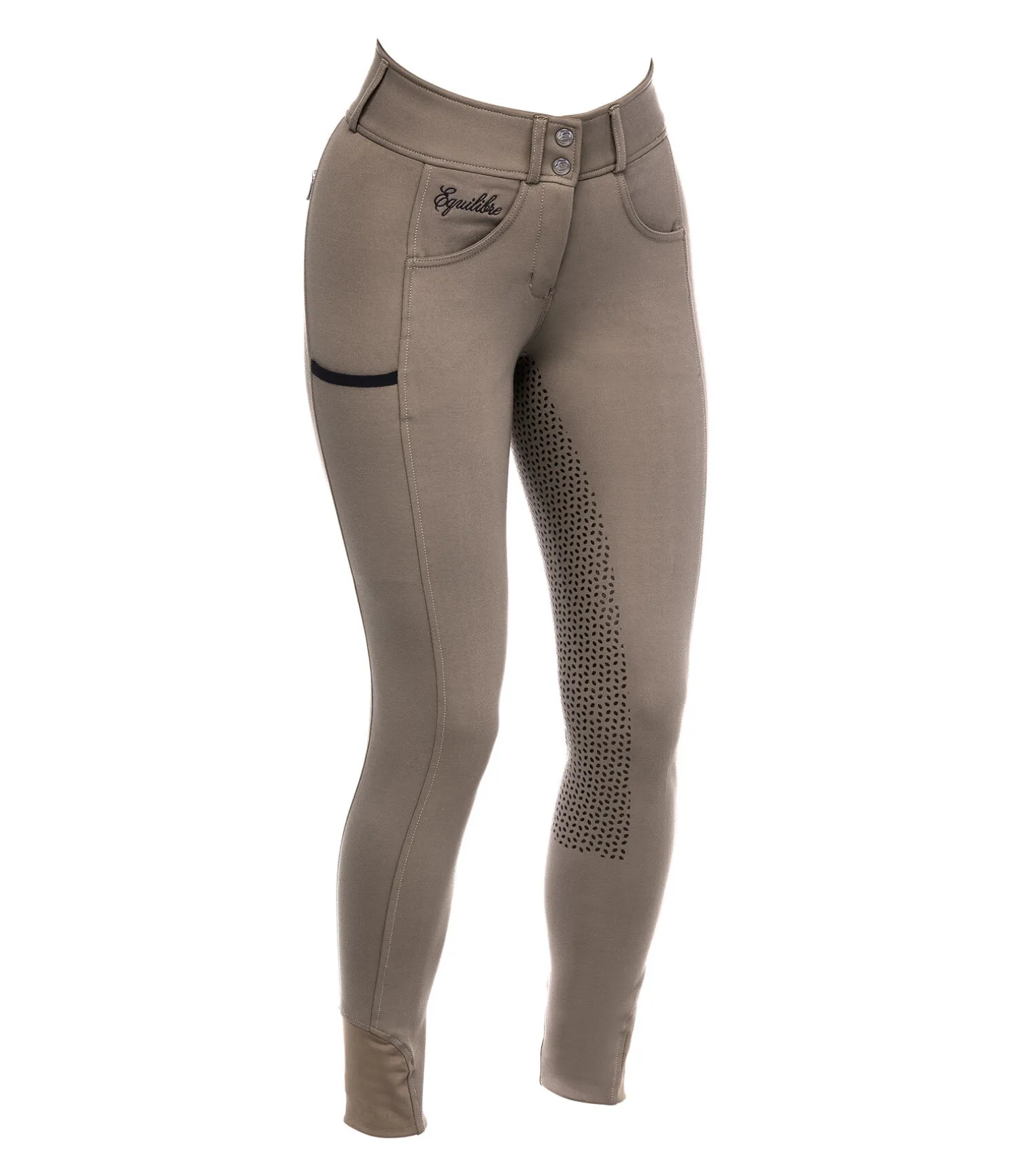 Pantalon d’équitation taille haute. Matière souple super confortable et extensible. Fond intégral grip en silicone. Aucune couture au niveau des genoux. Une poche latérale pour téléphone portable et une poche arrière zippée. Broderie sur l’avant et l’arrière. Bas de jambe extensible sans patte auto-agrippante. 68 % viscose, 27 % nylon, 5 % élasthanne.
