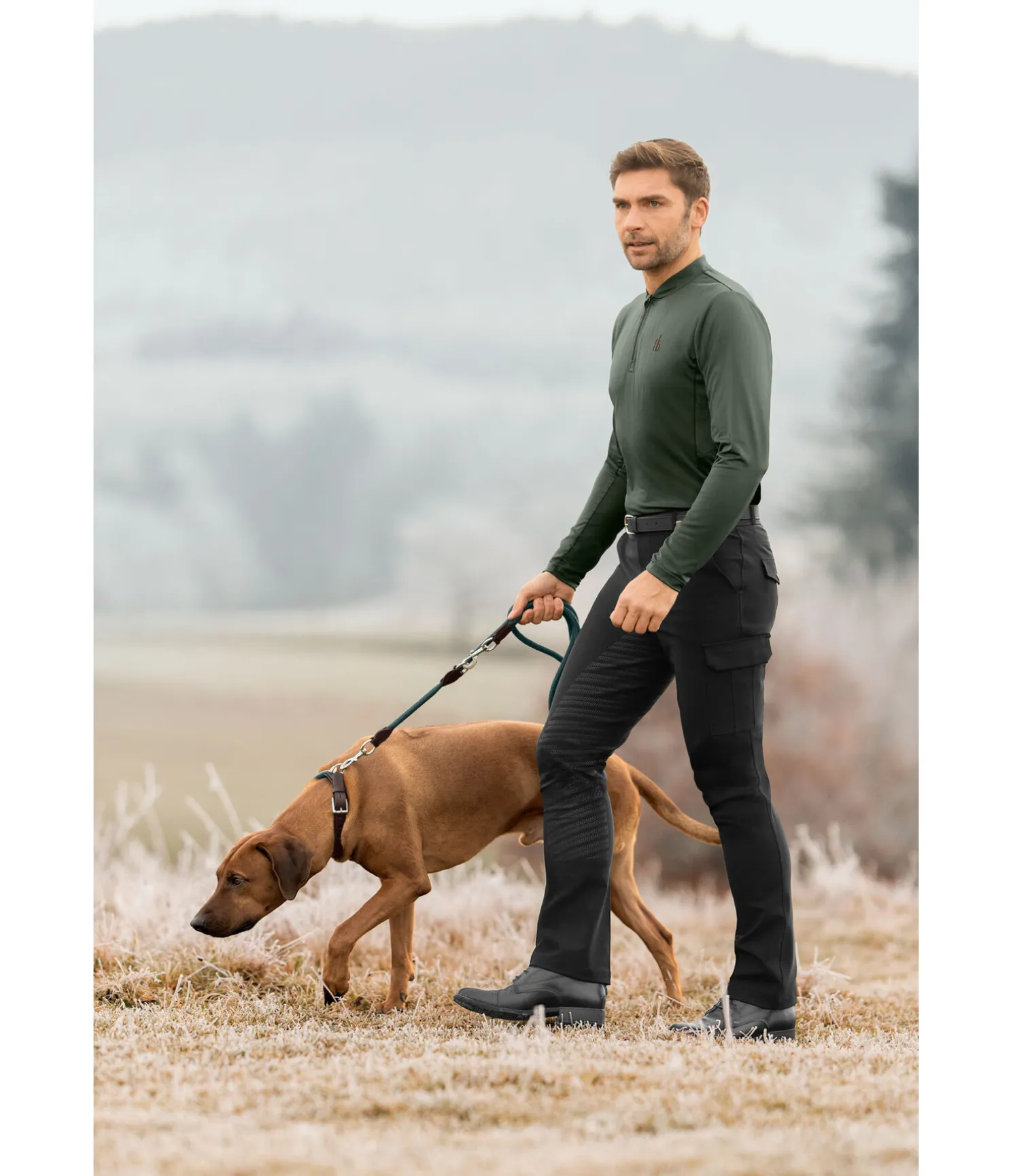 Pantalon d’équitation jodhpur moderne pour homme avec fond intégral en silicone. La matière stretch très extensible offre un confort incomparable. À séchage rapide et respirant. Poches latérales pour téléphone portable, 2 poches à bouton à l’arrière. Avec passants de ceinture. Imprimé logo ton-sur-ton discret. Sous-pieds élastiques en caoutchouc. 88 % polyester, 12 % élasthanne.