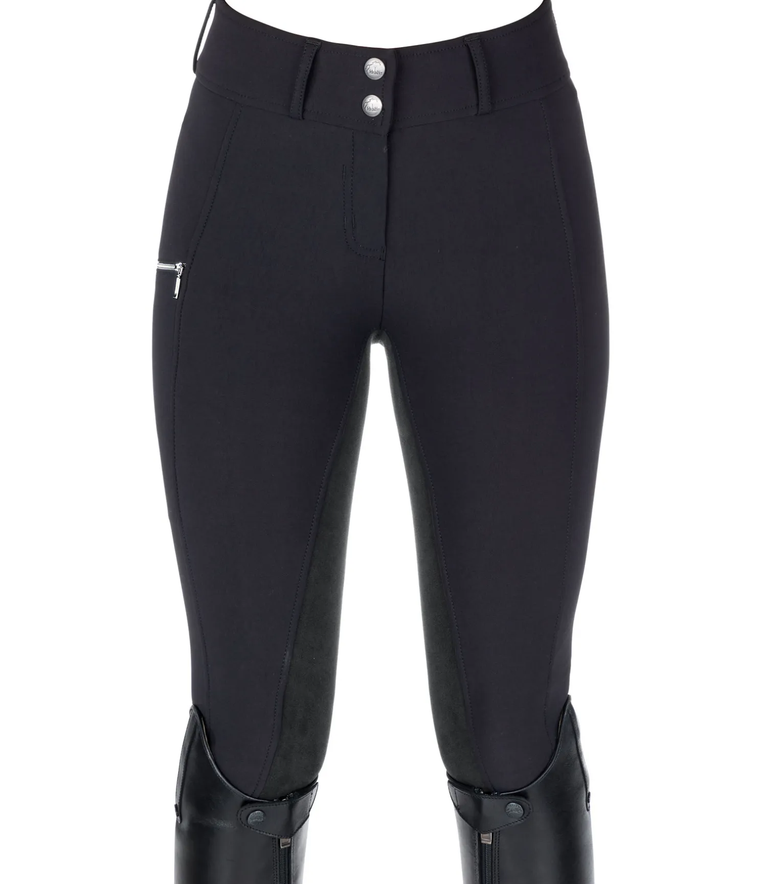 Joli pantalon d’équitation classique. Fond intégral imitation cuir. Taille haute. Matière extensible, déperlante, respirante, résistante à la déchirure et facile d’entretien. Poche zippée arrière et poche latérale zippée pour téléphone portable. Ceinture élastiquée. Bas de jambe extensible en matière stretch. Imprimé logo Felix Bühler. 93 % nylon, 7 % élasthanne.