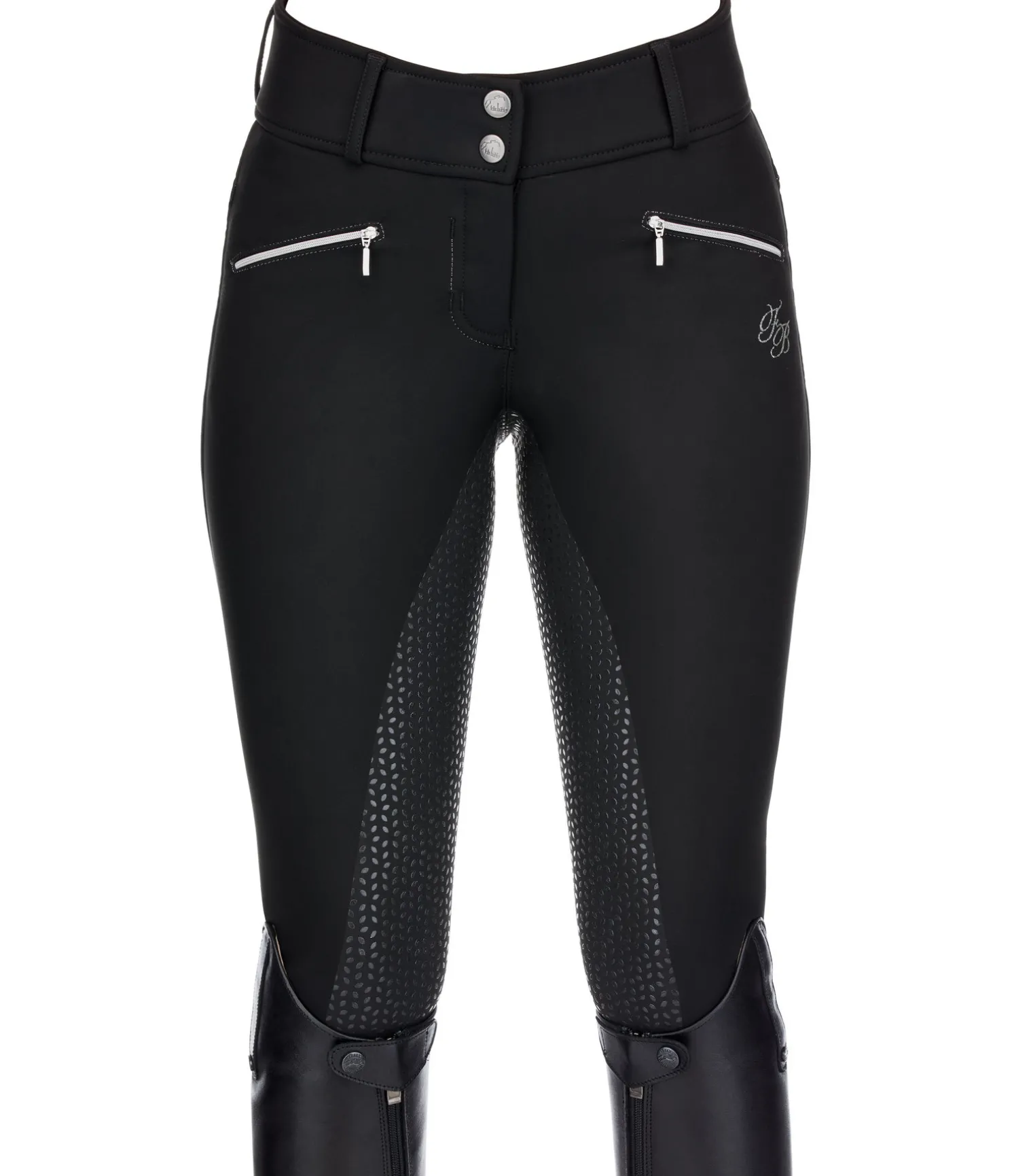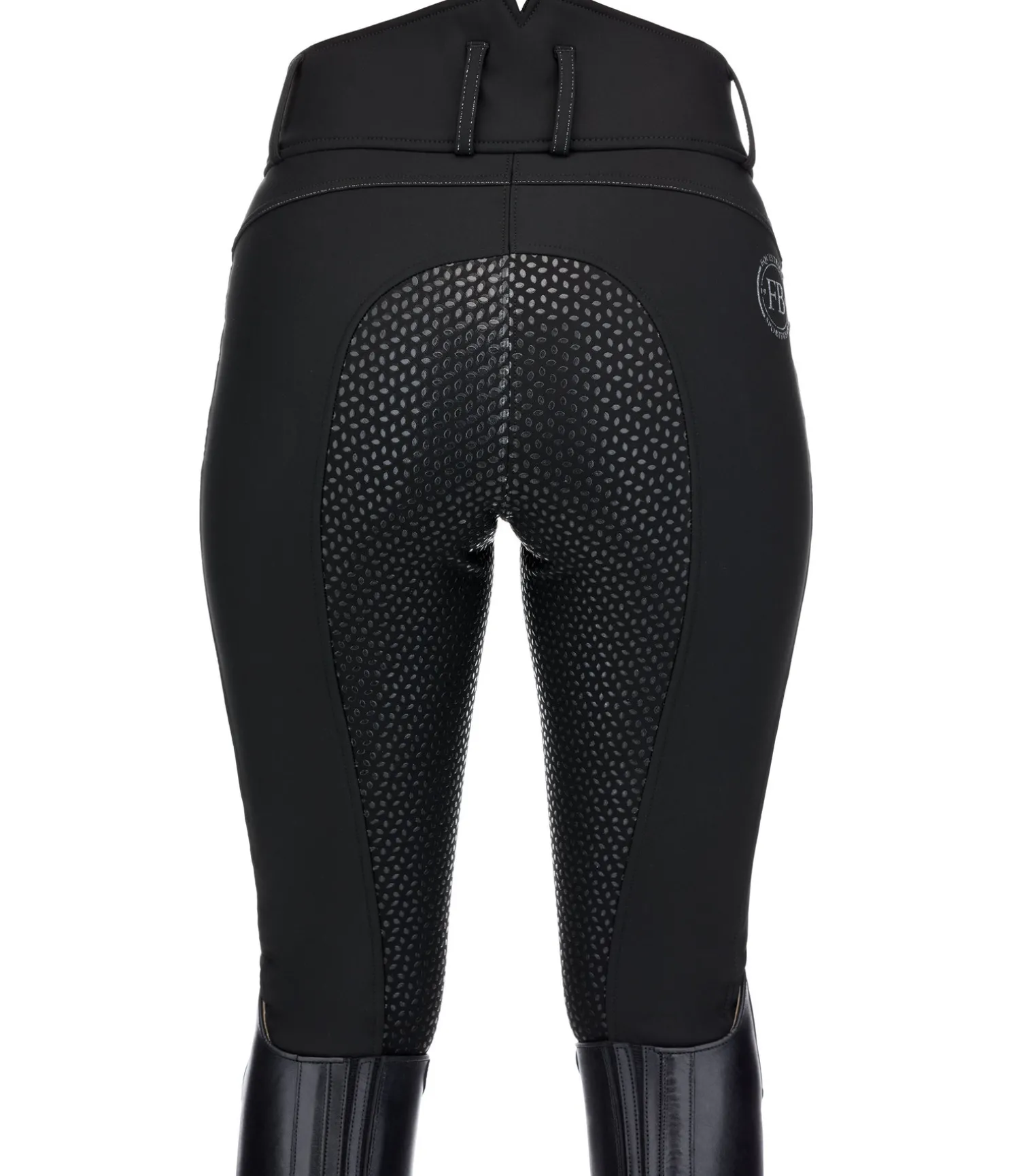 Élégant pantalon d’équitation avec fond intégral Grip siliconé. Taille haute. Coupe-vent et déperlant. Intérieur doux et confortable. Matière softshell extensible et agréable à porter, facile d’entretien et durable. Bas de jambe extensible sans patte auto-agrippante. Aucune couture au niveau des genoux. Jolis imprimés Felix Bühler en silicone. Deux poches zippées avant. Surpiqûres de couleur contrastante. Ceinture élastiquée. Extérieur 74 % nylon, 26 % élasthanne. Doublure 92 % polyester, 8 % élasthanne.