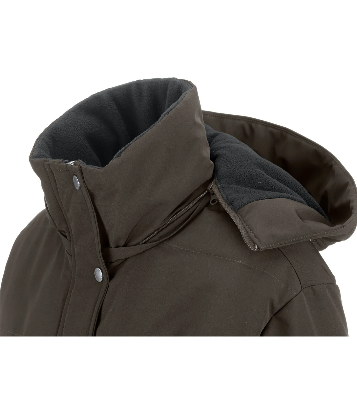 Parka effet doudoune solide, chaude et longue avec capuche. Capuche réglable rembourrée et doublée de polaire douce, amovible par fermeture à glissière et pouvant être fixée dans le dos par bouton-pression. Coupe-vent et très déperlante. Garnissage chaud en imitation duvet. Fermeture à glissière double sens dissimulée, 2 doubles poches plaquées et zippées dissimulées, toutes doublées de polaire chaude. 2 fentes cavalières avec boutons pression à l’arrière, 1 poche intérieure zippée, bas de manche avec finition bord-côte coupe-vent. 100 % polyester.