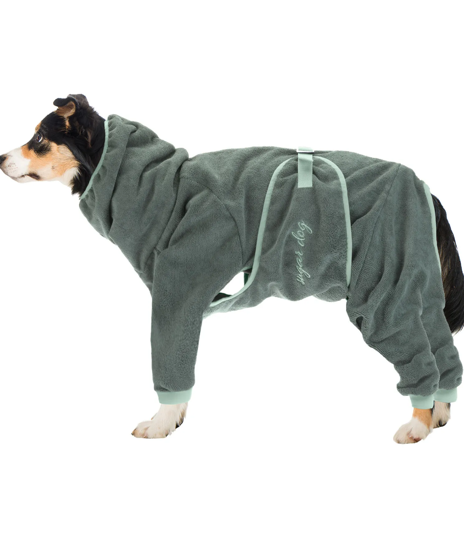 Idéal pour les chiens nageurs ou les jours de pluie : combinaison peignoir pour chien en tissu éponge doux à séchage rapide, absorbant l’humidité. Rabat ventral et col montant pour une protection intégrale. Protège la voiture et la maison de l’humidité et des salissures. Rabat ventral avec fermeture à clip réglable. Fermeture à glissière le long du dos pour faciliter l’enfilage et le retrait. Ouvrir les clips et la fermeture à glissière, laisser le chien passer la tête dans le col puis glisser délicatement ses pattes dans les ouvertures prévues à cet effet. Refermer ensuite la fermeture à glissière et les clips. Régler si besoin la longueur du rabat ventral afin que le peignoir tienne bien en place. 80 % polyester, 20 % nylon.
