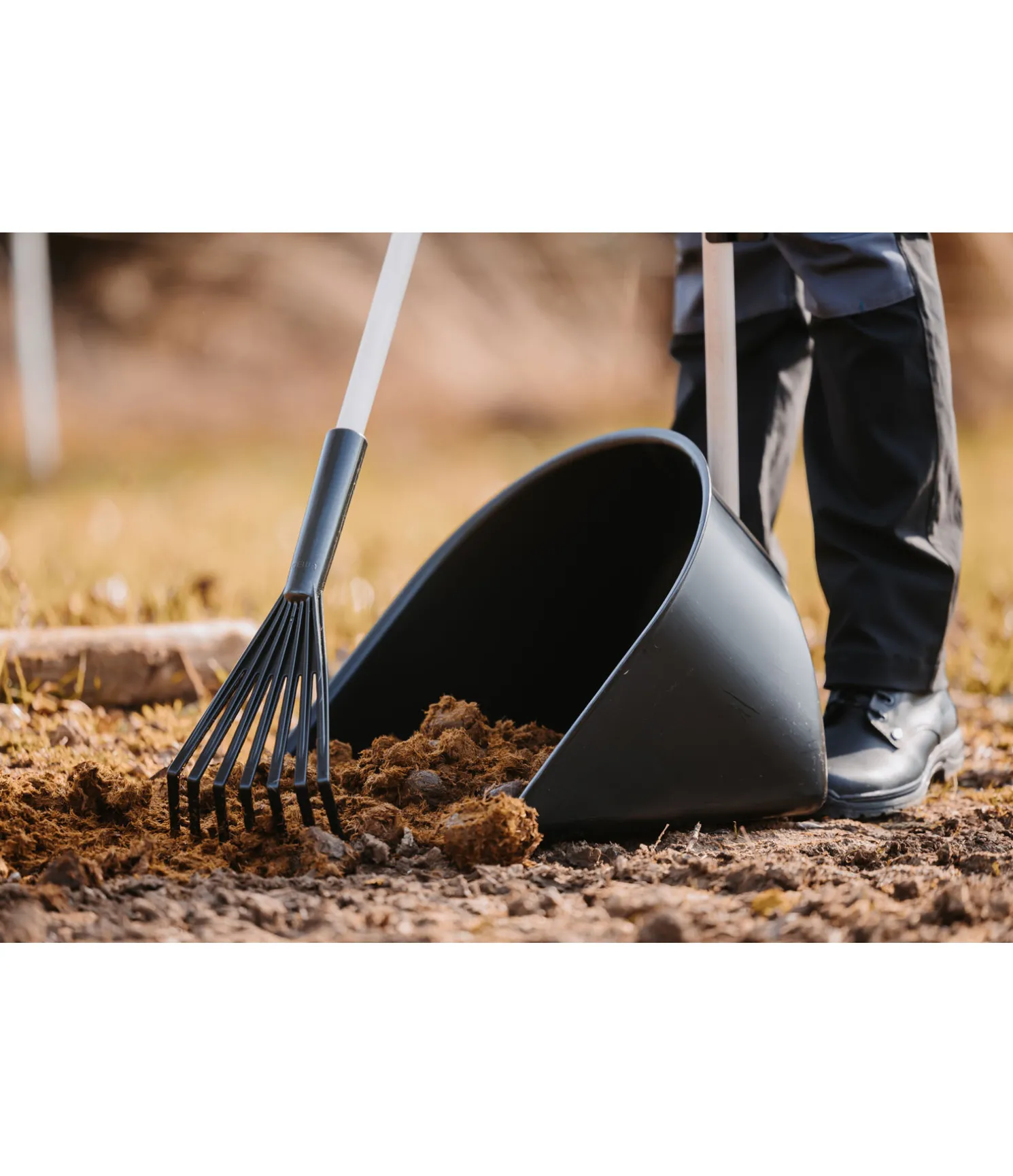 Pelle à fumier de grande capacité avec râteau à manche solide en hêtre. Pour débarrasser aisément le crottin à l’écurie, dans le manège et la zone de pansage, tout en préservant le dos grâce à la longueur du manche. Dim.: 30 x 40 x 35 cm, manche de 85 cm.