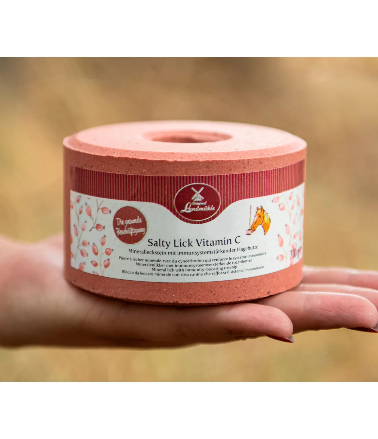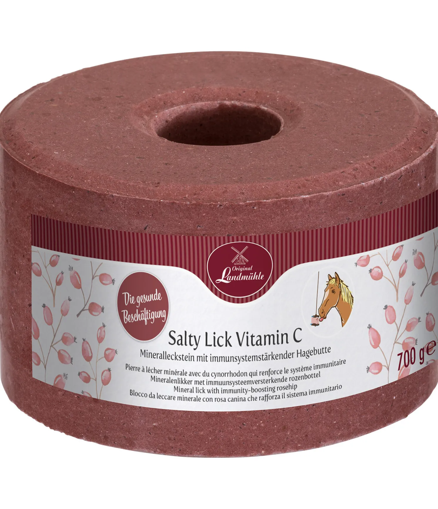 Une occupation saine : la pierre à lécher minérale sans mélasse, sans céréales et sans glucose. À base de sel marin méditerranéen. Avec du cynorrhodon riche en vitamine C pour un système immunitaire fort. Riche en iode naturel, en minéraux, en oligo-éléments et en vitamines essentielles. Peut aider à réduire l’agitation et l’ennui et à diminuer le stress qui en résulte, surtout en cas de repos au box. Complète une alimentation saine ! 700 g. À suspendre à l’aide de notre corde de suspension Original Landmühle (art. 490 788) !