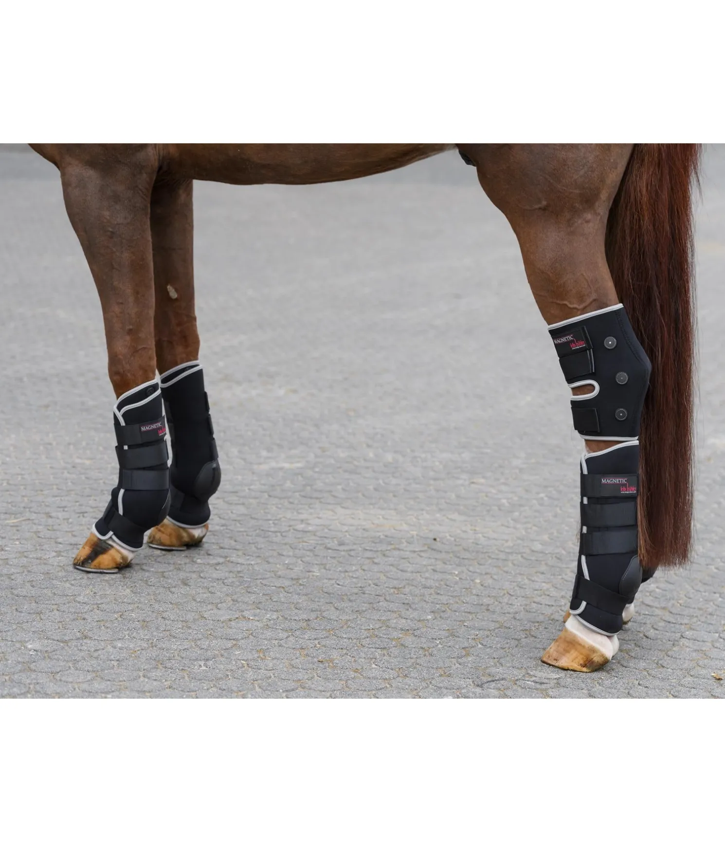 Protège-jarrets anatomiques à usage thérapeutique en caoutchouc chloroprène avec 6 aimants (30 % néodyme, 65 % fer, 5 % bore, force magnétique : 2800 gauss) qui permettent de soulager les douleurs articulaires et d’améliorer la circulation sanguine. Taille réglable grâce aux 3 pattes auto-agrippantes.Vendus par paire.
