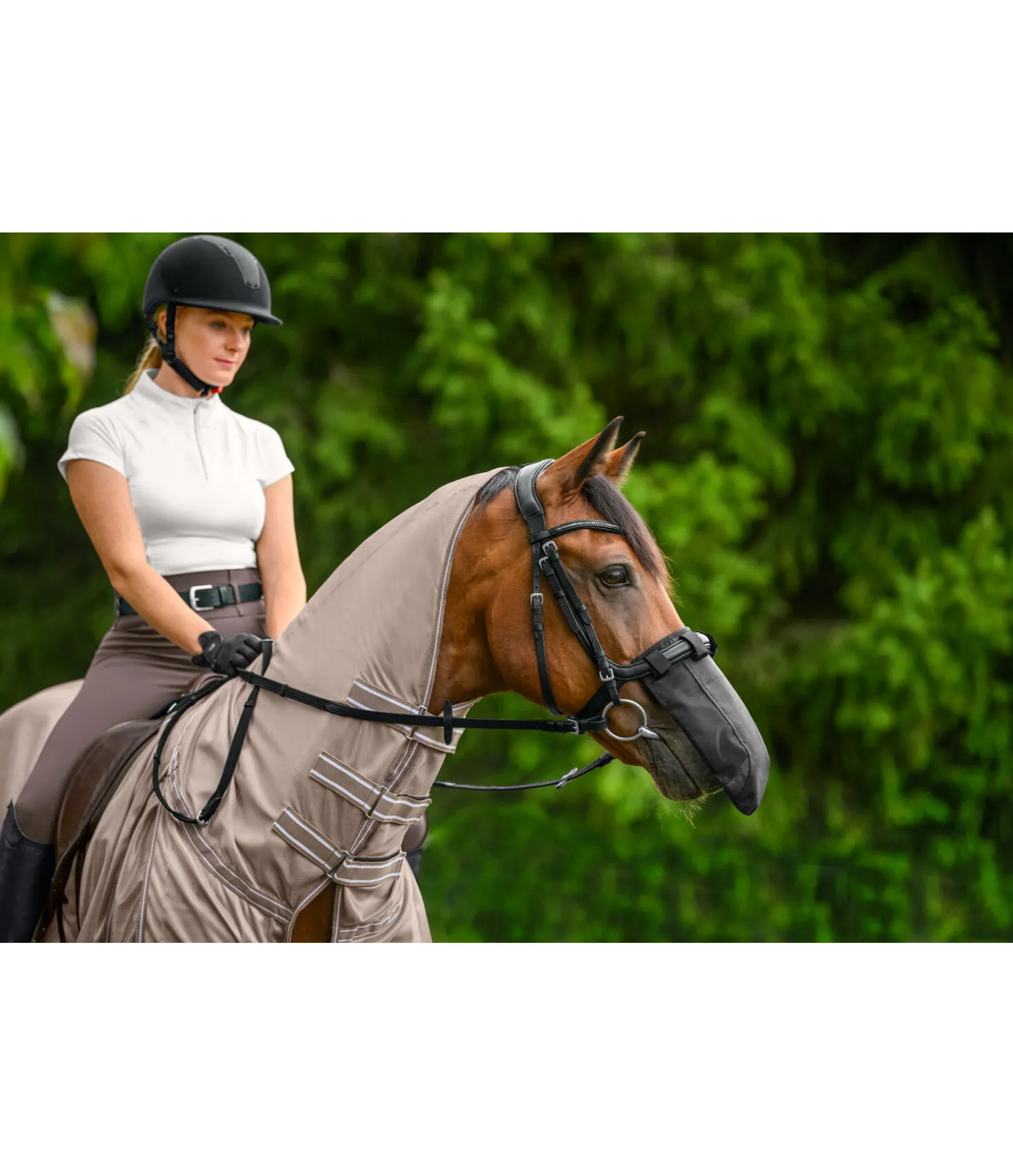 Conception innovante en maille ripstop solide et fine et en polyester Oxford 600 deniers respirant pour protéger la zone sensible des naseaux contre les rayons du soleil. La maille ripstop bloque au moins 60 % des rayons UV et offre en même temps une protection sûre contre les mouches. Au milieu, le tissu en polyester Oxford bloque 97 % des rayons UV. Se fixe facilement au licol ou à la muserolle à l’aide de pattes auto-agrippantes. Doublure intérieure douce en tissu éponge. 100 % polyester.