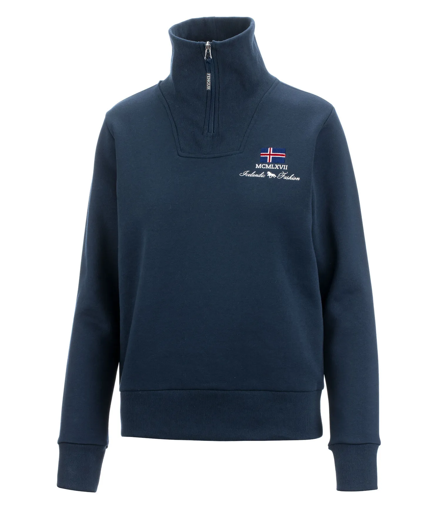 Pull coll camionneur zippé en coton stretch de grande qualité. Doux et sportswear. Finition en bord-côte en bas des manches et à la taille. Logo imprimé dans le dos. 65 % polyester, 35 % coton.