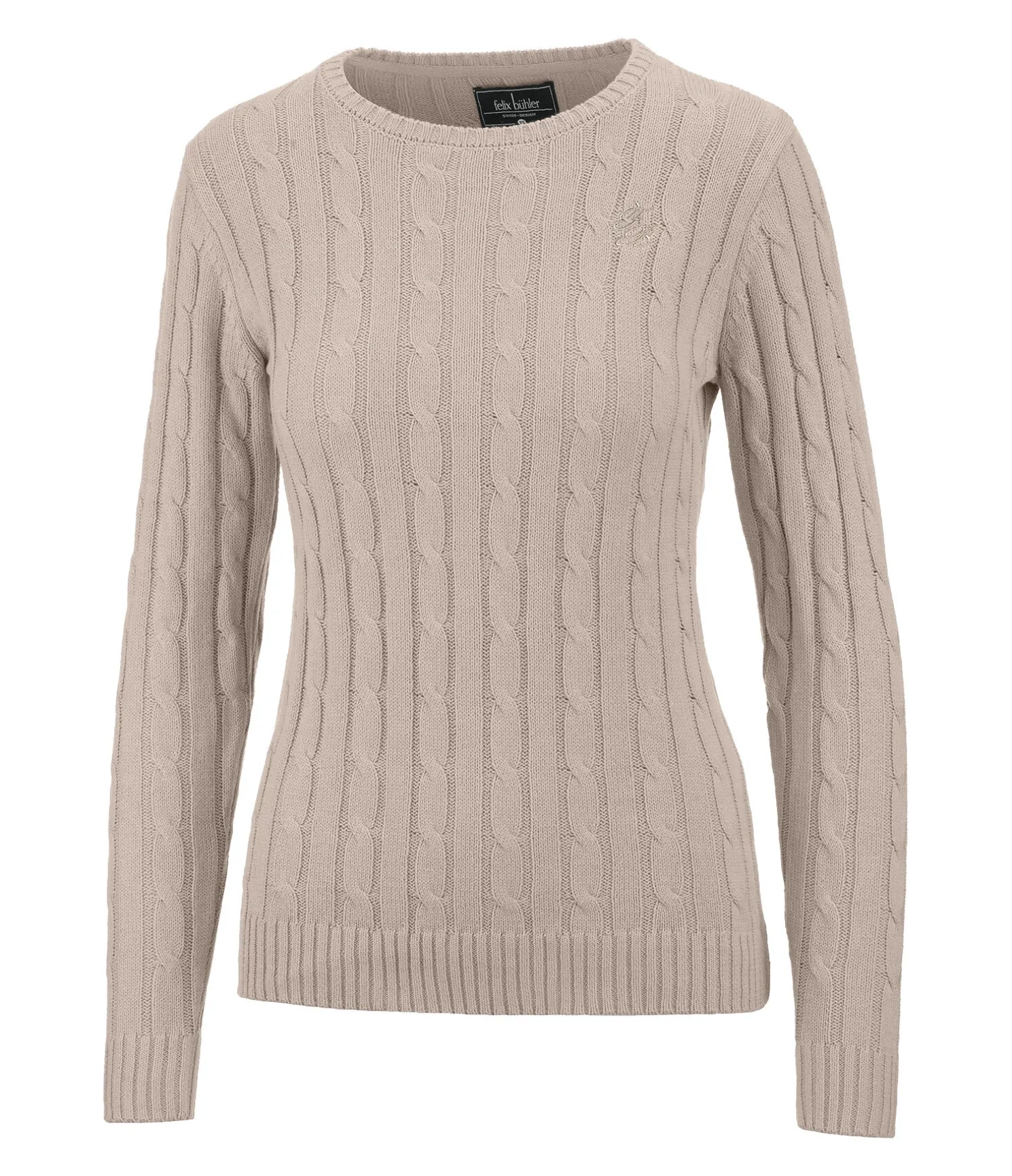 Pull-over à col rond classique et doux en tricot torsadé. Broderie Felix Bühler sur la poitrine. Bordure côtelée en bas des manches et à la taille. 60 % coton, 40 % polyacrylique.