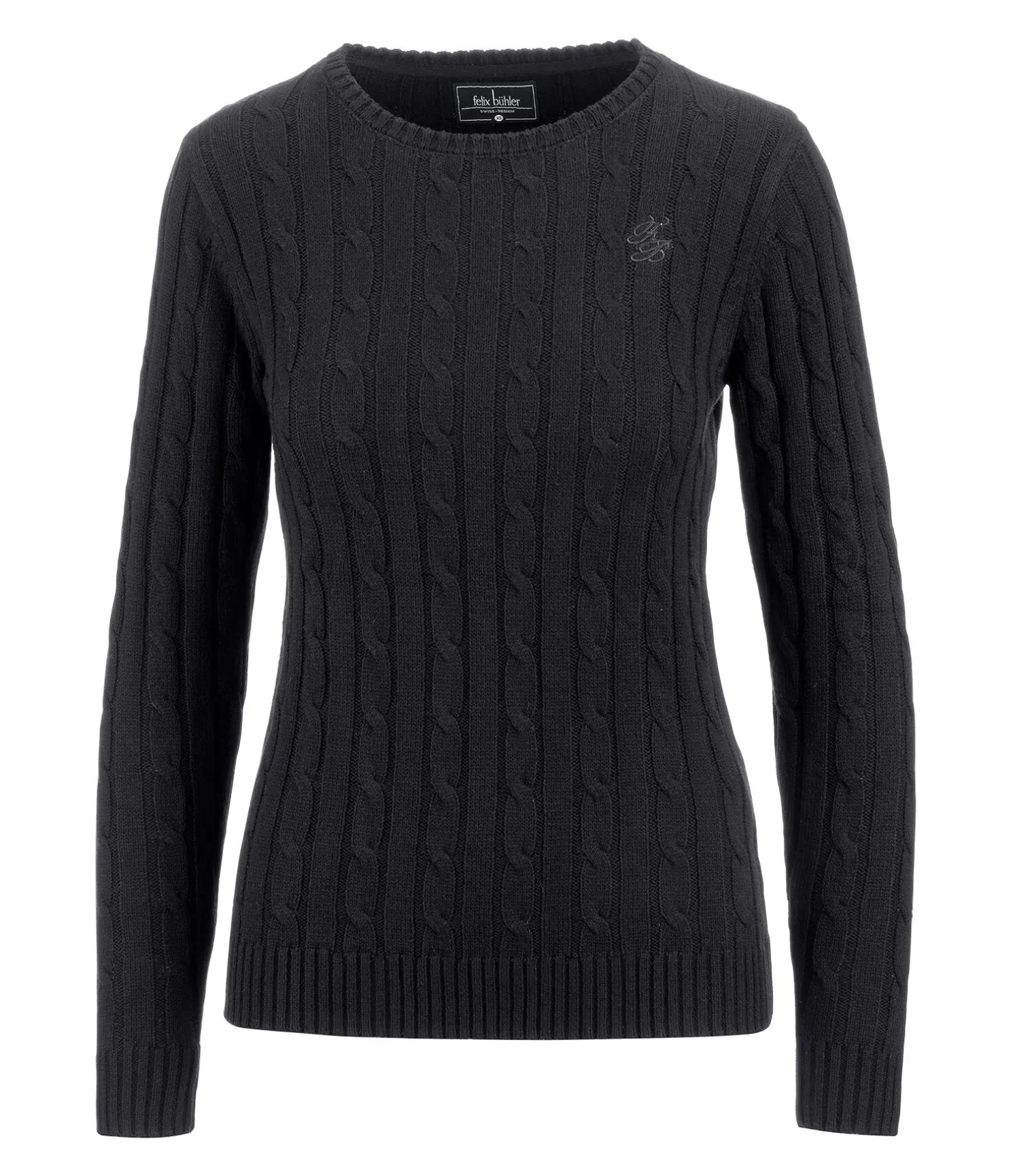 Pull-over à col rond classique et doux en tricot torsadé. Broderie Felix Bühler sur la poitrine. Bordure côtelée en bas des manches et à la taille. 60 % coton, 40 % polyacrylique.