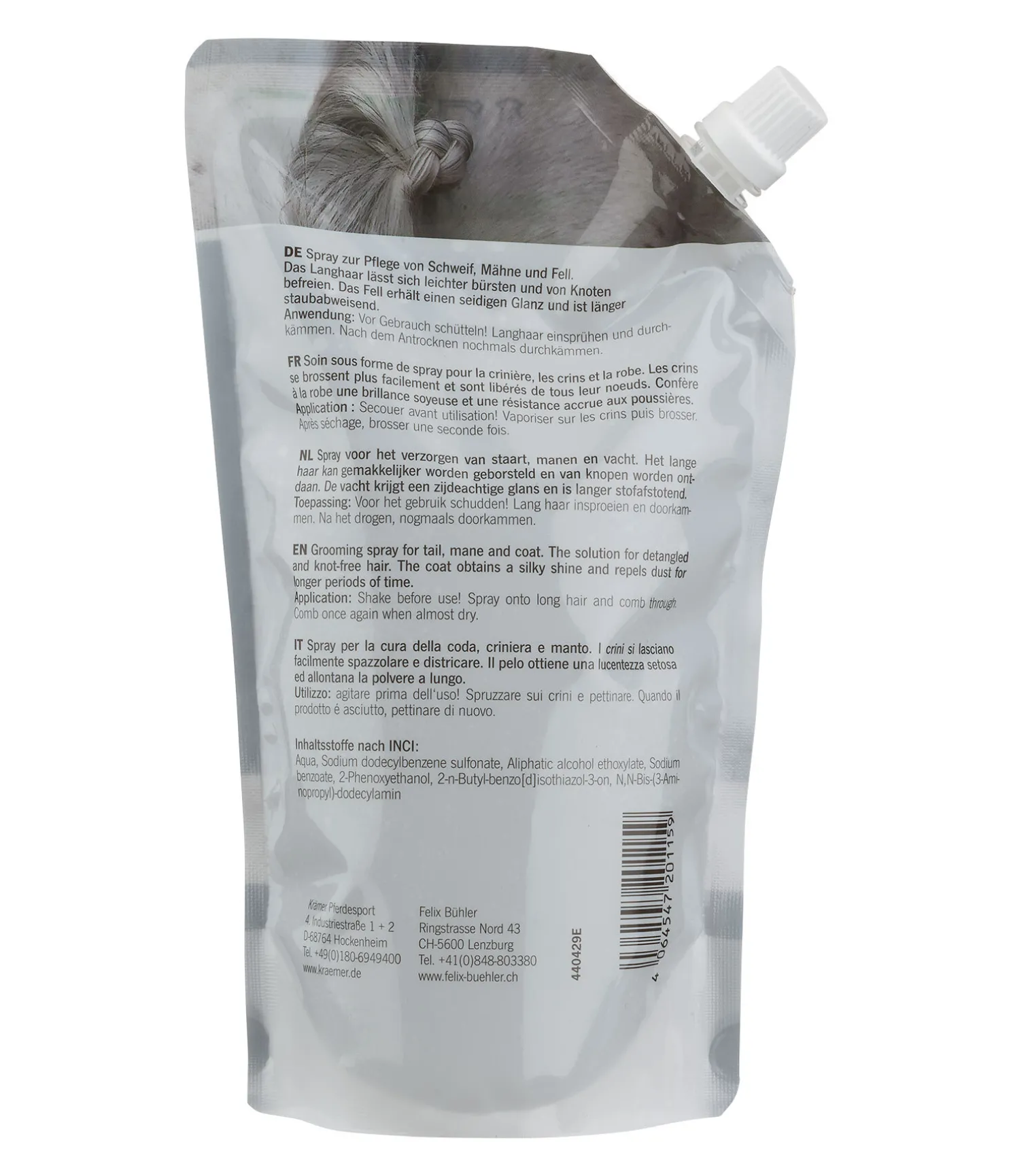 Spray à crins pour le soin de la robe, de la crinière et de la queue sous forme de recharge écologique et durable – 50 % d’emballage en moins en comparaison au pulvérisateur habituel et jusqu’à 100 % recyclable ! Les crins sont plus faciles à brosser et à démêler. Confère à la robe une brillance soyeuse, un toucher incroyablement doux et empêche les poussières de s’y accrocher. Pendant toute la période d’effet du produit, la queue, la crinière et la robe de votre cheval seront brillants et soignés. Les taches d’urine, d’herbe ou de sueur séchées seront faciles à faire disparaître au brossage.