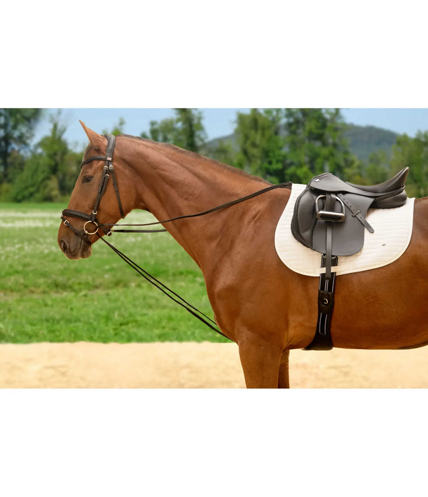 Les rênes allemandes se composent de deux rênes. Elles se fixent entre les antérieurs à la sangle puis passent dans les anneaux du mors, de l’intérieur vers l’extérieur, pour venir dans les mains du cavalier. Enrênement non autorisé en compétition.