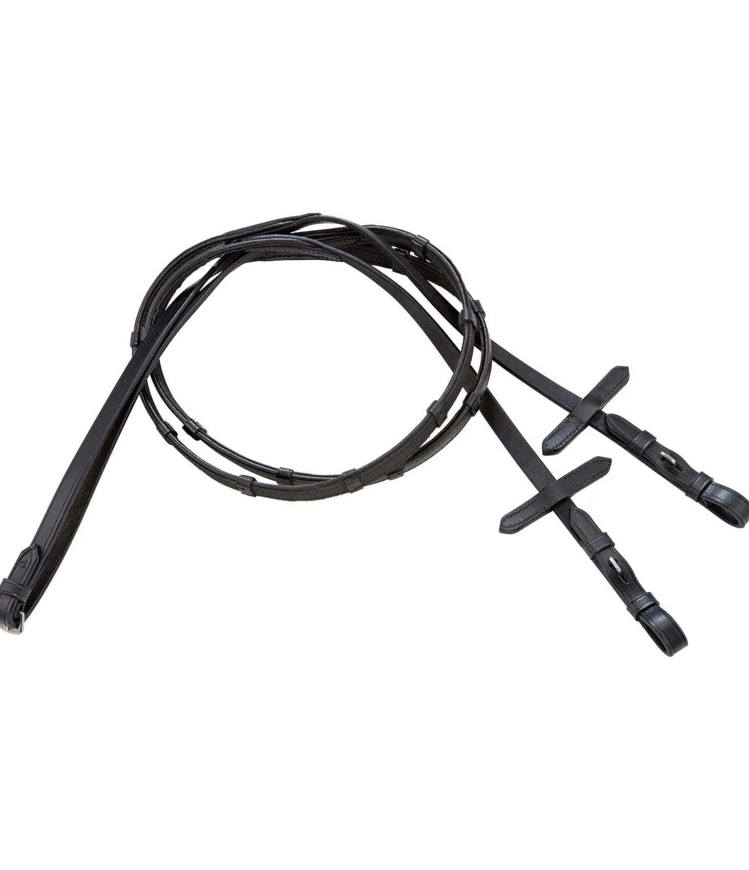 Rênes antidérapantes particulièrement agréables en main. Revêtement en caoutchouc sur une face. Avec arrêtoirs en cuir et arrêtoirs de martingale. Largeur de 1,5 cm. P (poney – longueur 260 cm), F (full – longueur 290 cm), XF (taille maxi – longueur 305 cm).