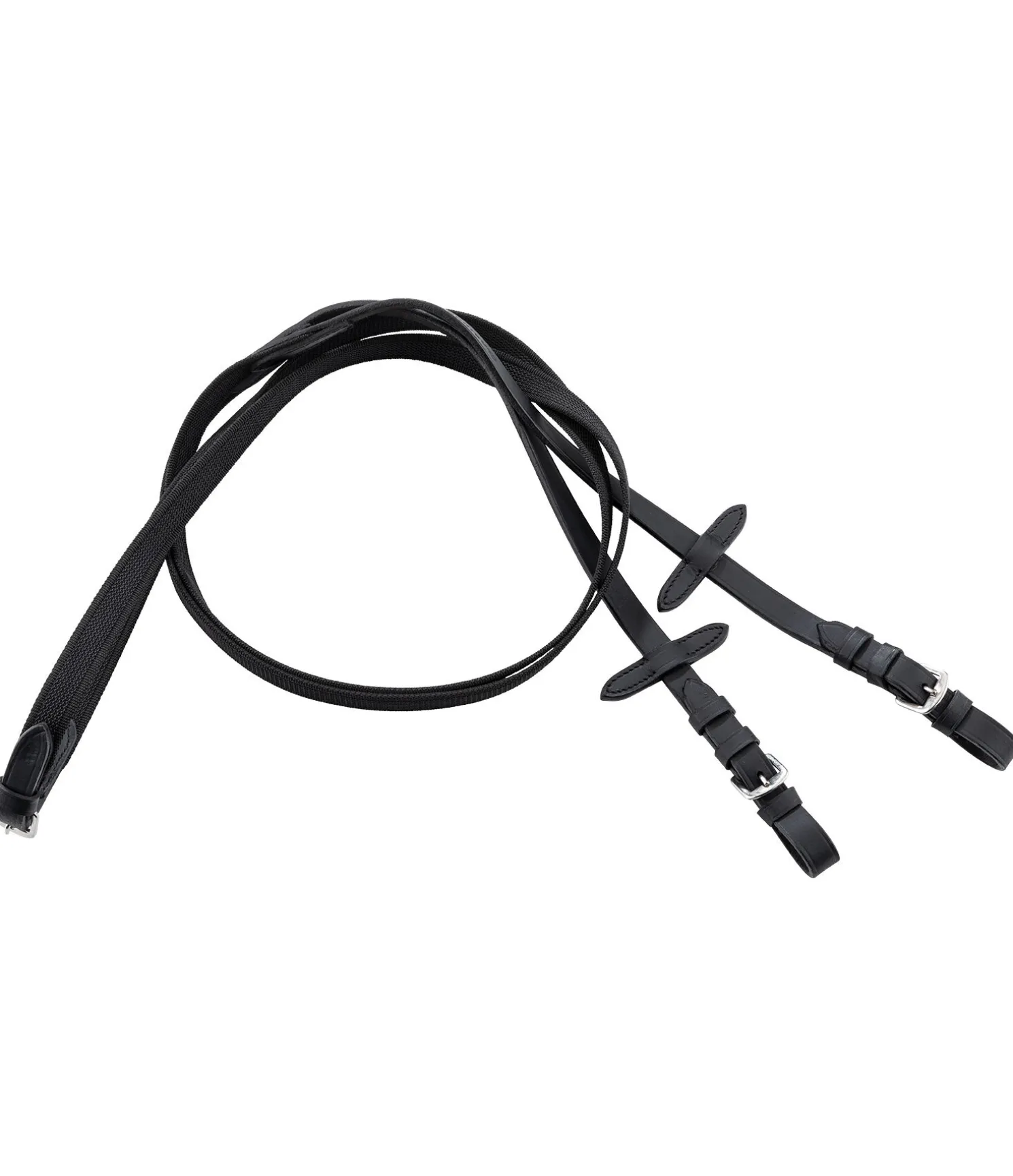 Rênes en cuir véritable agréables en main. Revêtement caoutchouté antidérapant et extrémités en cuir gras particulièrement souple. Arrêtoirs de martingale. Bouclerie argentée. Largeur 1,9 cm, longueur : C (poney) = 280 cm, F (cheval)= 290 cm.