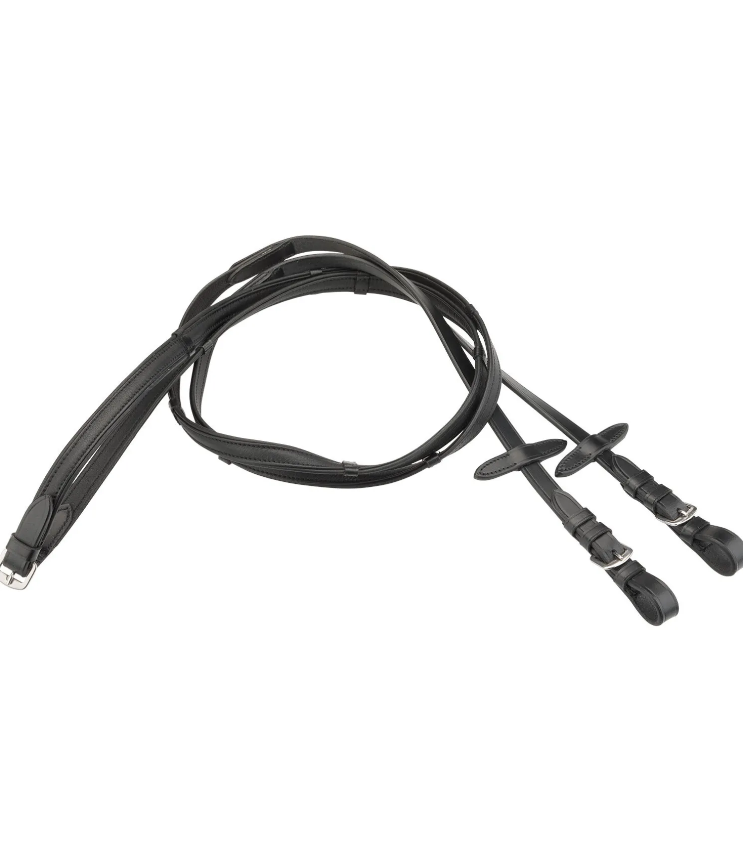 Rênes en cuir gras souple avec arrêtoirs en cuir et arrêtoirs de martingale. Bouclerie argentée. Adhérentes et douces en main. Largeur 1,6 cm, arrêtoirs 1,9 cm.