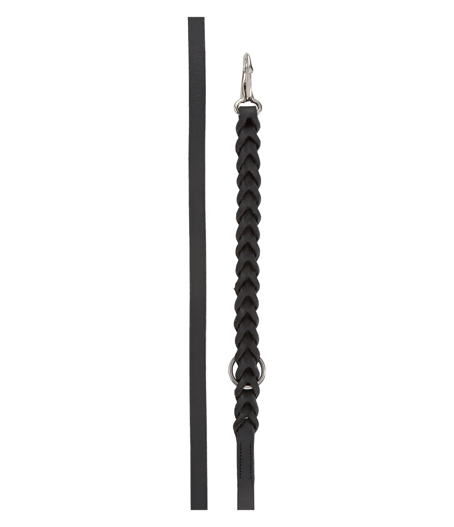 Rênes en cuir gras multifonction idéales pour de longues randonnées à cheval. Mousquetons snaps ovales métallisés. Extrémités tressées.L’anneau métallique présent de chaque côté permet de clipser un mousqueton et d’utiliser les rênes comme longe et mener son cheval en main ou le faire brouter.
