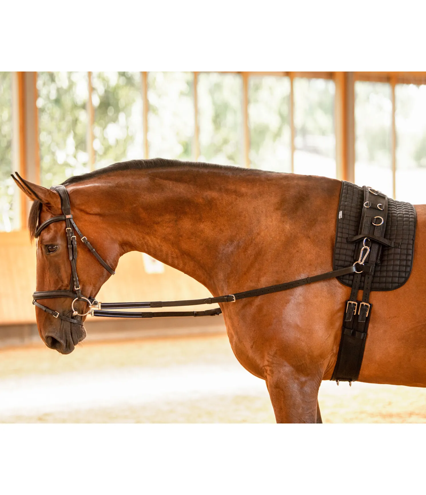 Rênes fixes en cuir solide avec empiècements élastiques doublés pour une connexion douce à la bouche du cheval. Fixation rapide aux anneaux du mors à l’aide des clips. Idéales pour le travail en longe ou monté. 100 % cuir, empiècements élastiques 100 % nylon.