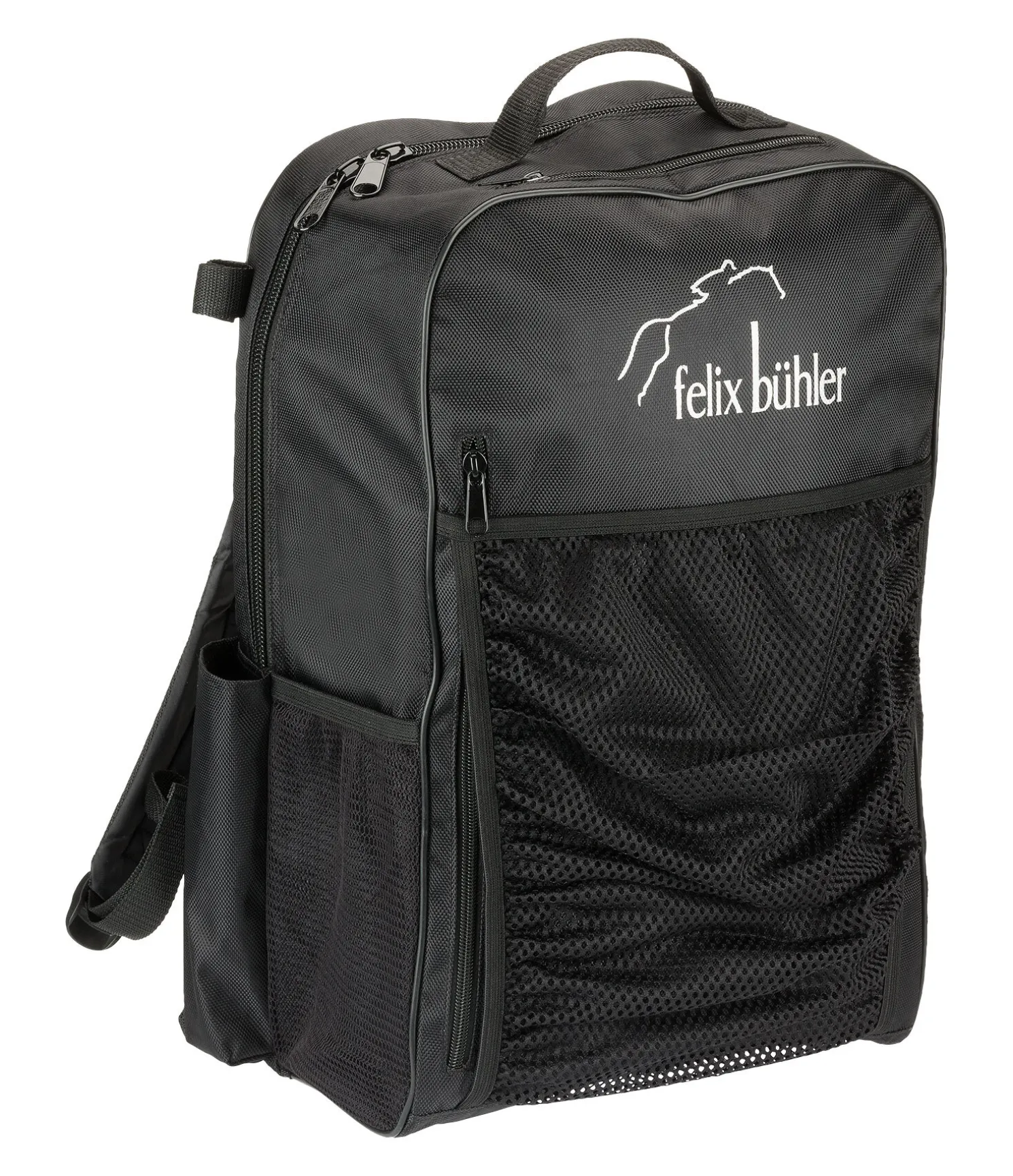 Sac à dos d’équitation pratique et élégant avec compartiment extérieur pour le casque. Conçu en nylon robuste. Doté de deux poches latérales extensibles pour ranger facilement des bouteilles d’eau ou des produits de soin, d’une poche rembourrée pour smartphone et d’un petit compartiment latéral pour ranger la cravache. Grande poche zippée pour stocker un gilet ou autre. Grand compartiment intérieur avec espace de rangement pour la protection dorsale avec fermeture par patte auto-agrippante. Possibilité de ranger une paire de bottes d’équitation jusqu’à 38 cm (sac taille M) ou 50 cm (sac taille L). Bretelles rembourrées et réglables en longueur. Poignée de transport. Dimensions taille L : 35 x 52 x 17 cm – Dimensions taille M : 30 x 40 x 13 cm.