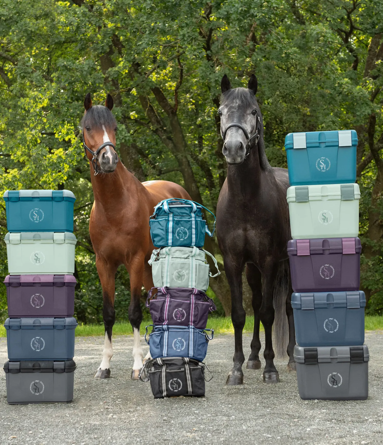 Sac de pansage au look sportif confectionné dans une matière anti-salissures. Avec 6 poches extérieures, 2 anses et une bandoulière amovible. Refermable par le haut au moyen d’un cordon de serrage. 28 x 18 x 25 cm.