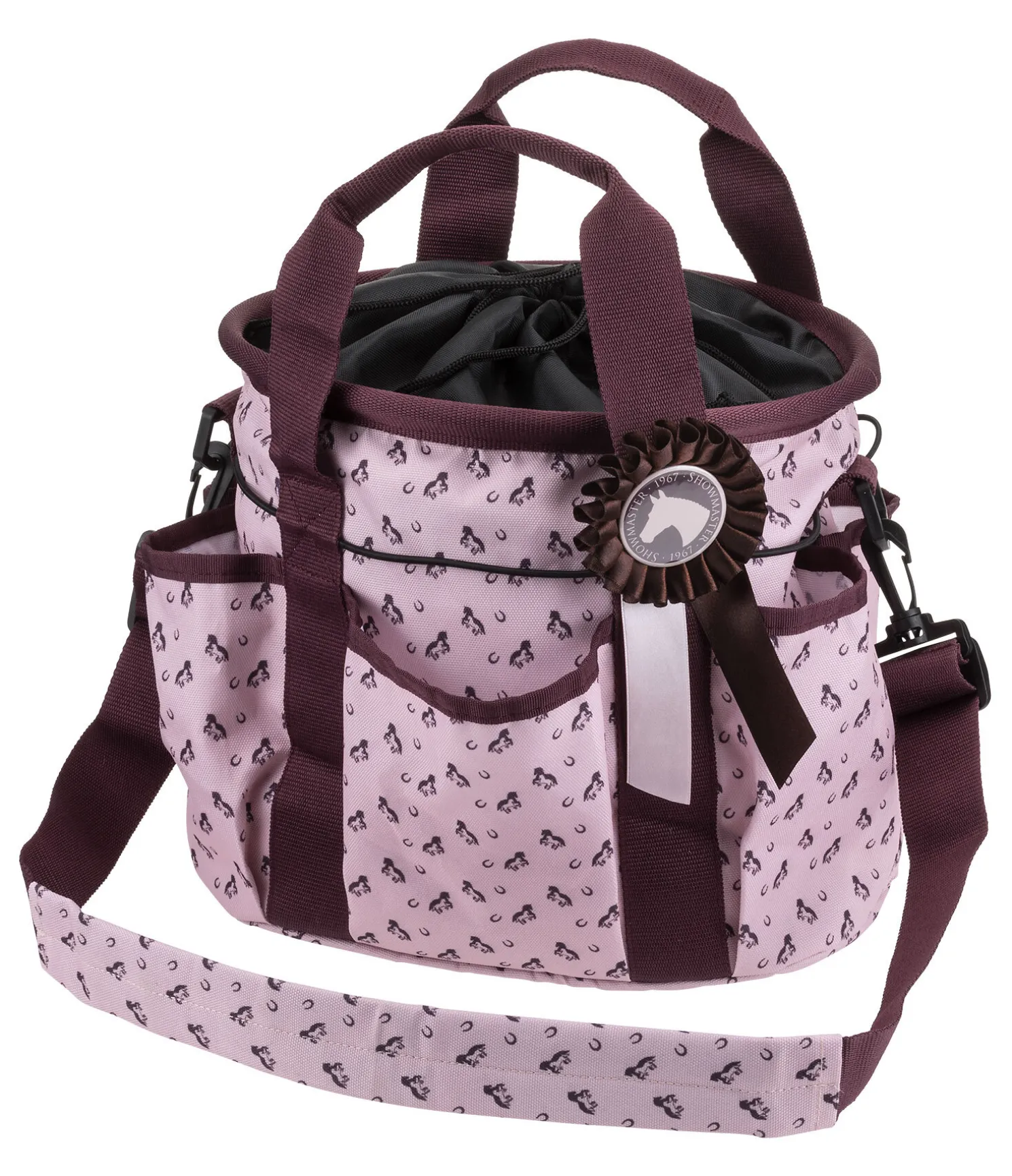 Sac de pansage pratique spécialement conçu pour les enfants avec imprimé de petits chevaux et de fers à cheval et flot assorti pour les petits champions. Les 6 poches extérieures permettent d’accéder rapidement aux accessoires essentiels. Équipé de deux poignées et d’une bandoulière rembourrée amovible. Fermeture sur le dessus par cordon de serrage. 28 x 18 x 25 cm. Matière anti-salissures. 100 % polyester.