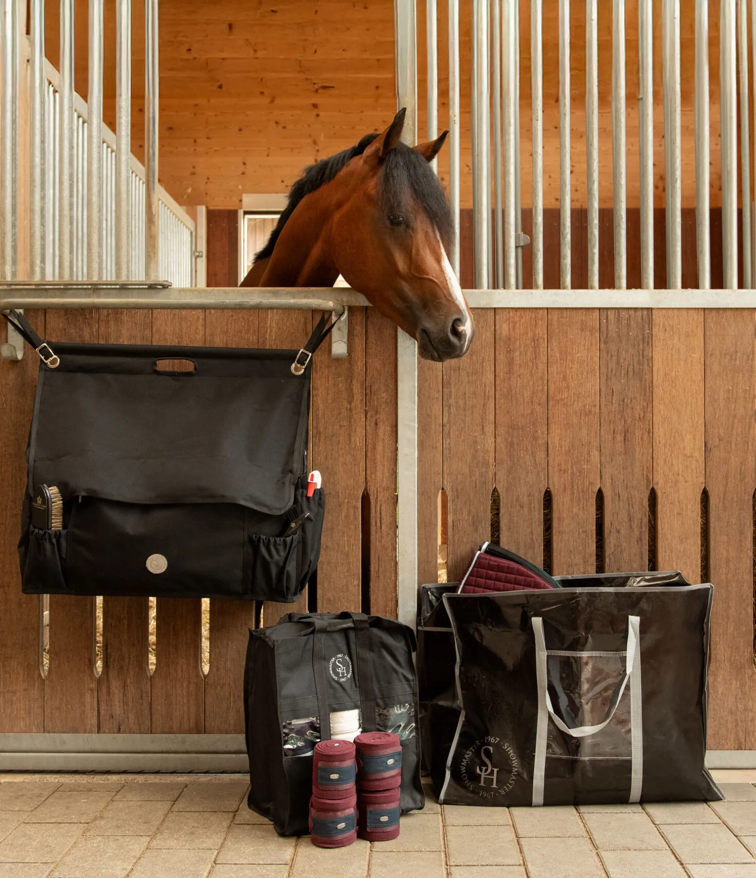 Sac pour le box spacieux avec rangements modulables à l’intérieur. Fermeture par pattes auto-agrippantes et fermeture à glissière pour une protection optimale contre les saletés. Deux poches à l’avant et sur les côtés. Poche zippée à l’avant et anneaux sur les côtés. Compartiment de rangement pour les bandes. Deux sangles réglables pour la fixation au box et poignée de transport. Jolie plaque métallique SHOWMASTER. 61 x 70 x 18 cm. 100 % polyester.