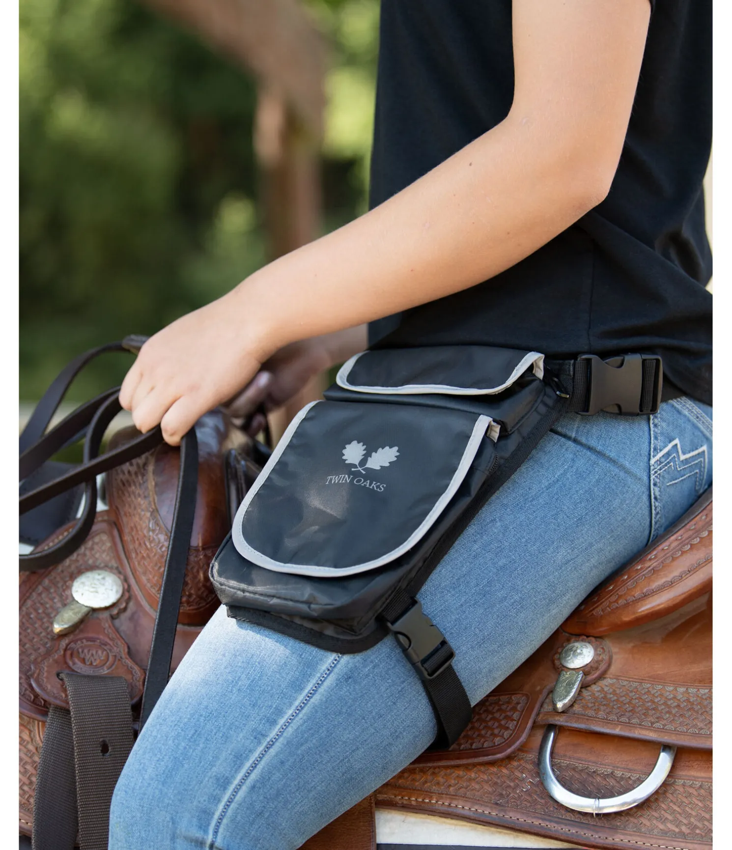Sacoche en matière déperlante pour ranger les objets à emmener en randonnée. Se fixe à la jambe du cavalier pour éviter de marquer la selle. Réglable. Détails réfléchissants et nombreux rangements. Hauteur : 27,5 cm, profondeur : 6 cm, largeur en haut : 20 cm.