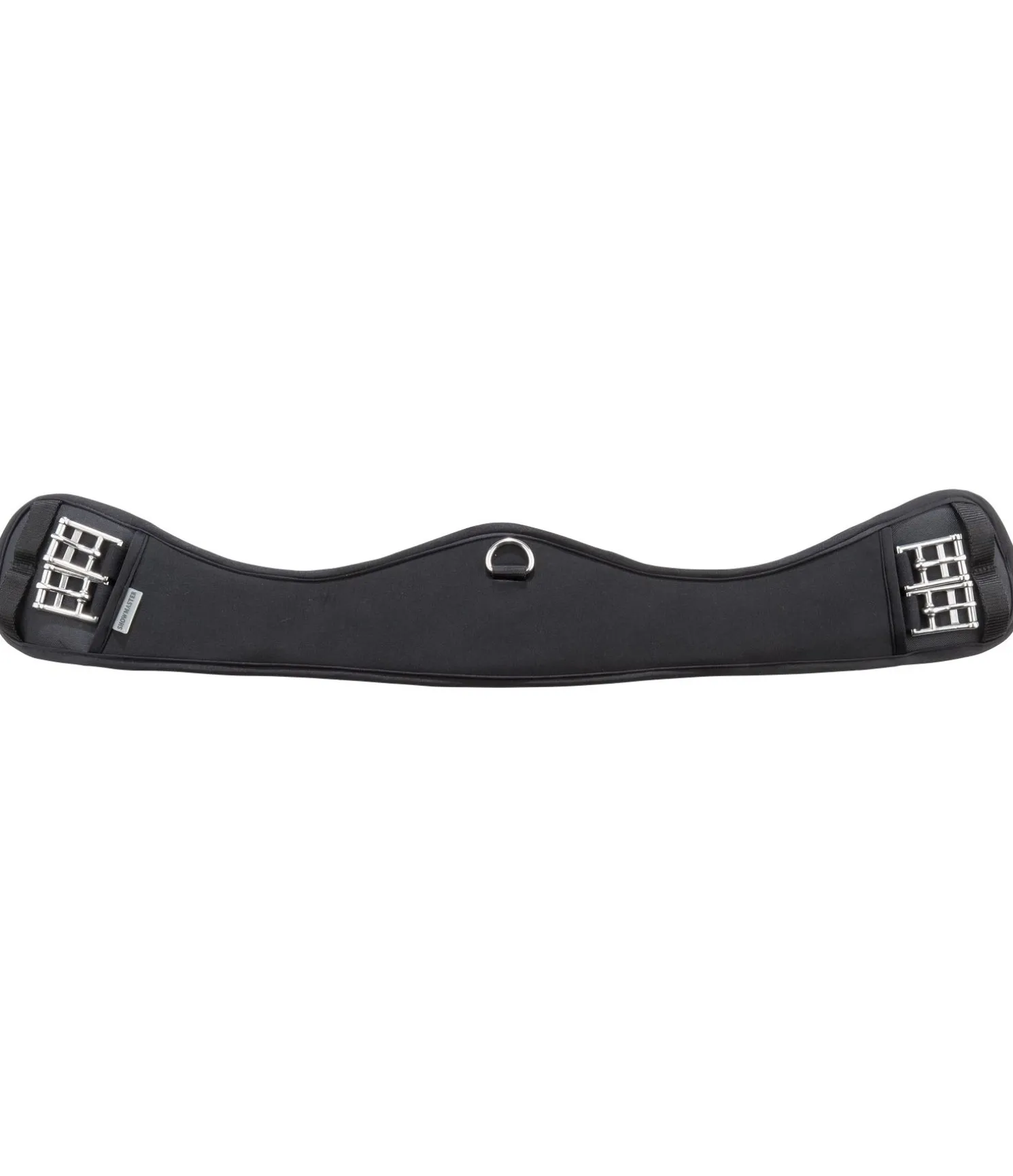 Sangle de dressage avec courbe anatomique, idéale pour les chevaux ayant besoin de beaucoup d’espace pour les coudes et chez lesquels le sanglage a tendance à faire glisser la selle vers l’avant. Mousse à mémoire de forme. Absorbe les chocs et les pressions puis retrouve son aspect initial. Dessus en caoutchouc chloroprène souple. Surface de contact anatomique large. Boucles à rouleau en acier, anneau en D au milieu. Largeur : 8,5 à 13 cm.