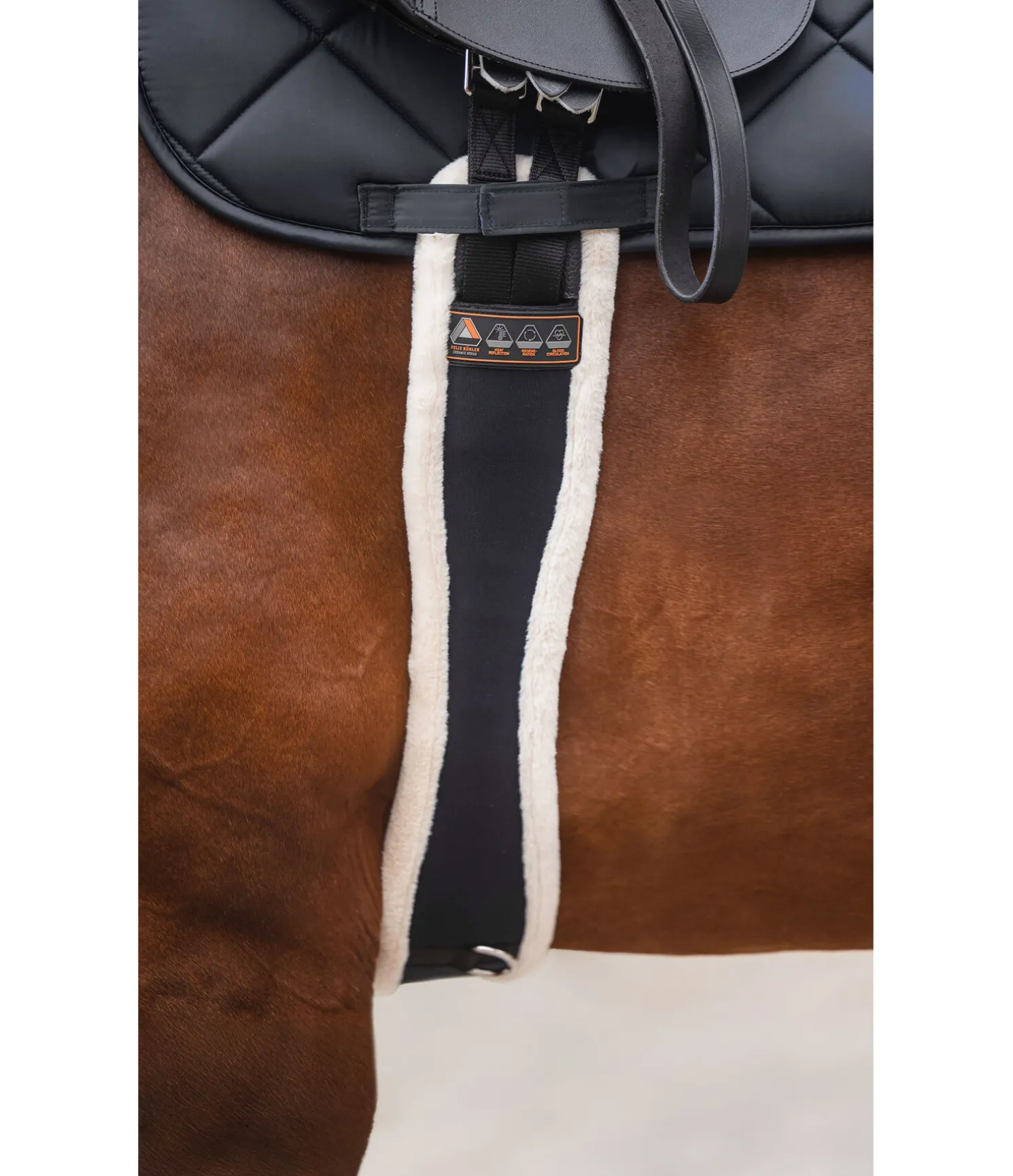 Sangle anatomique avec garnissage intérieur respirant en Air mesh contenant des fibres de céramique pouvant stimuler la circulation sanguine et ainsi prévenir ou soulager les tensions. Bordure en polaire Teddy douce pour éviter les frottements. Sans insert élastique. Avec anneau en D central et boucles à rouleau en acier inoxydable. Lavable en machine à 30°C (refermer les pattes auto-agrippantes et utiliser un sac de lavage pour protéger le tambour de votre machine des pièces métalliques). Largeur de la sangle 8-11 cm. Matière extérieure 100 % caoutchouc chloroprène, garnissage et polaire Teddy 100 % polyester.