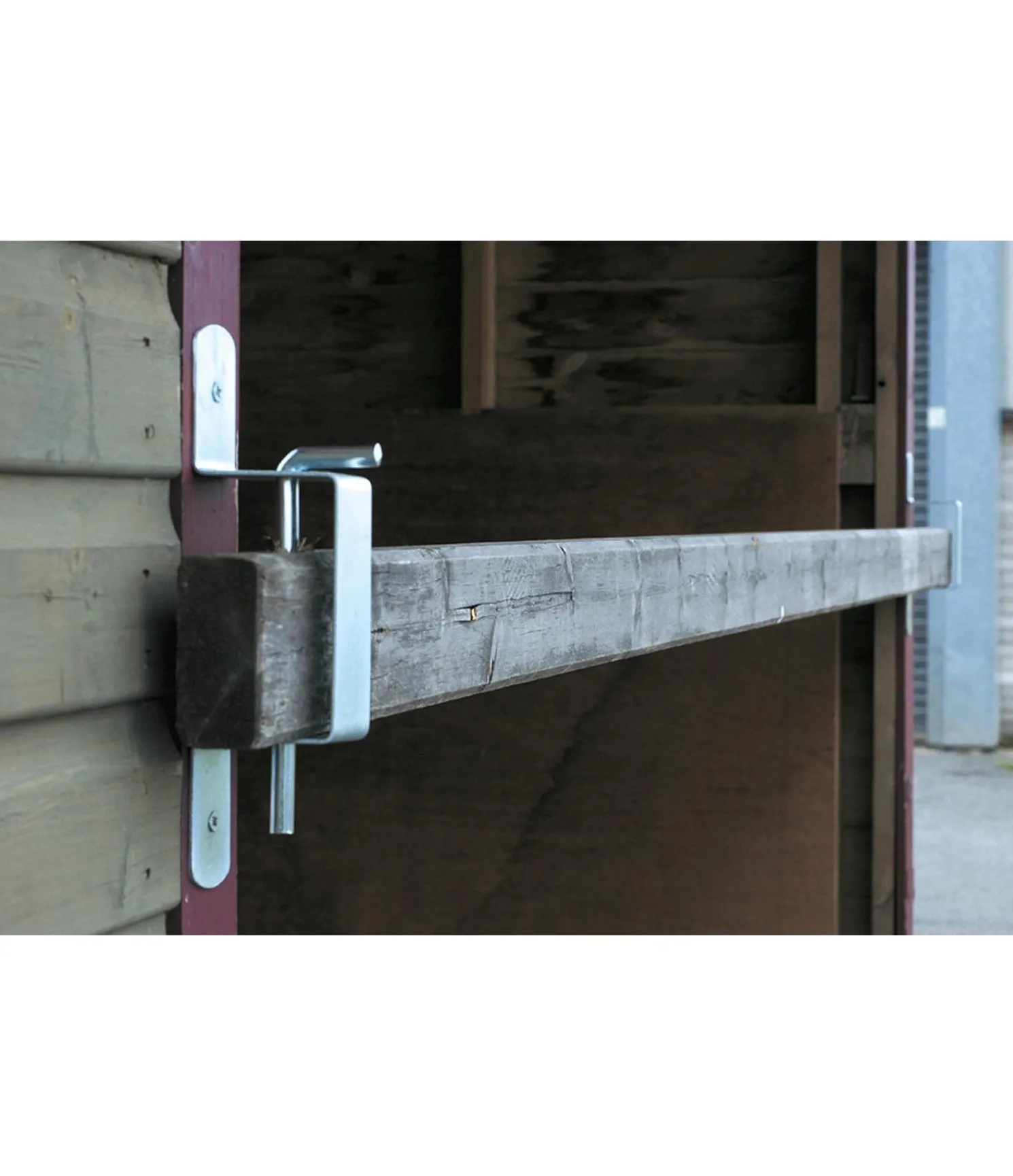Lot composé de 3 supports et 1 verrou. À placer partout, sur un portail ou une porte, où le passage doit pouvoir être ouvert et fermé. La poutre repose sur 2 supports et est maintenue en position fermée grâce à la broche. Pour ouvrir, enlever la broche et faire coulisser la poutre jusque dans le troisième support afin qu’elle reste maintenue. Articles zingués afin de résister aux intempéries. Adaptés à des poutres de max 5 x 7 cm. Hauteur totale de chaque support : 12,5 cm