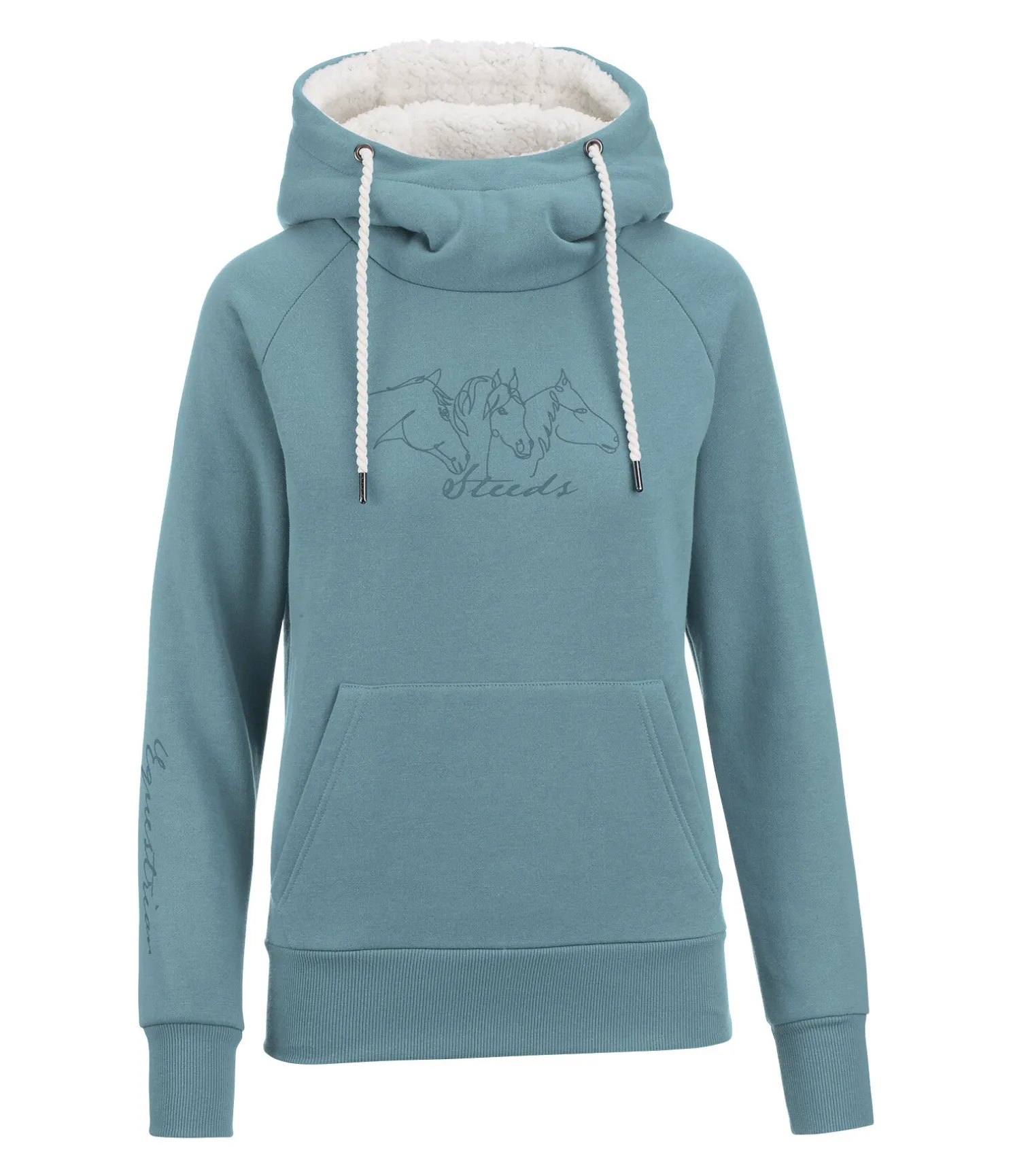 Sweat confortable avec capuche réglable doublée en polaire Teddy extra douce. Imprimé 3 têtes de cheval sur la poitrine. Imprimé «Equestrian» sur la manche. Poche kangourou. Bord-côte doux en bas des manches et à la taille. 65 % polyester, 35 % coton.