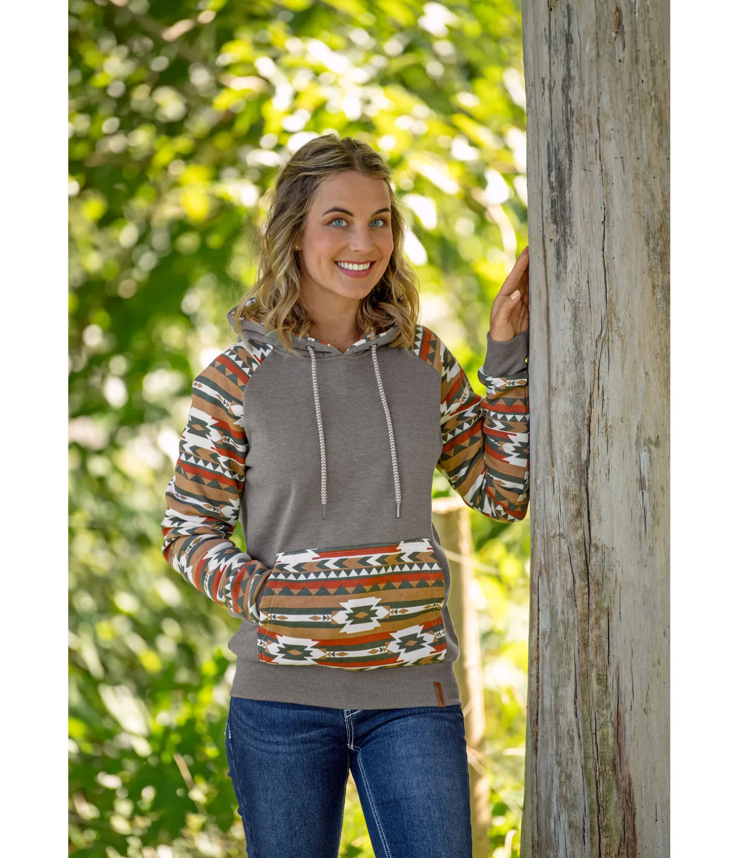 Sweat à capuche avec motif aztèque. Poche kangourou. Finition en bord-côte à la taille et en bas des manches. 60 % coton, 40 % polyester.