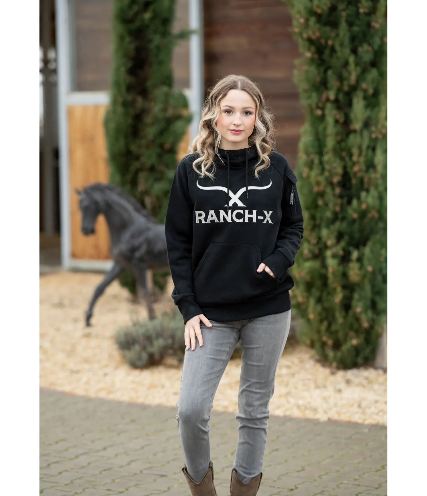 Sweat à capuche sportswear. Matière respirante. Logo RANCH-X en cuir sur la poitrine. Capuche ajustable par cordon de serrage. Poche kangourou. Poche zippée pratique sur la manche. Finition en bord-côte sur le bas des manches. 65 % coton, 35 % polyester.